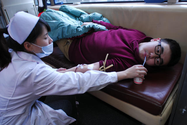 献血成为两个部分进行,中心血站工作人员先对参与献血的老师进行了抽样化验,从血型、乙肝等疾病、血液质量等多个方面进行检测,合格者方能参与献血。几位第一次参加献血的老师开玩笑的说:“献血好处多,化验还能检查身体有无疾病。”据悉,本次参与献血者全部通过了抽样检测,参与了献血。