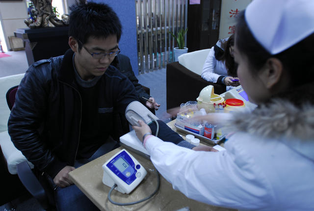 献血前的抽样化验,图为青年教师熊坚在测量血压