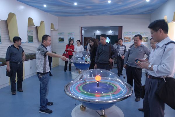 座谈结束,在陈校长、学校党政办顾江红主任和教务科周一坪主任的陪同下,代表团一行先后走进地理、生物、英语等五大学科基地,身临其境的感受高科技与教学的有效结合。在株洲市地理学科基地主持人彭武燕老师的带领下,他们一起钻进“地球内部”、观看火山喷发、仰看“星空的奥妙”,还亲身体验了一把“模拟地震”。