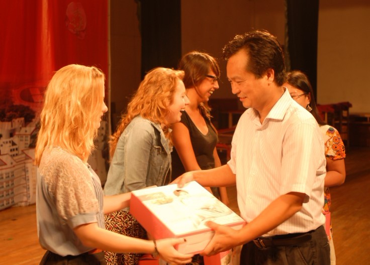 远洋而来的几名外教们也高兴地参加了庆祝大会,夏校长亲自为她们赠送了节日礼物。