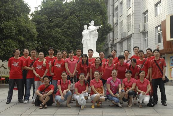 身穿红色“战斗服”的送考老师全家福