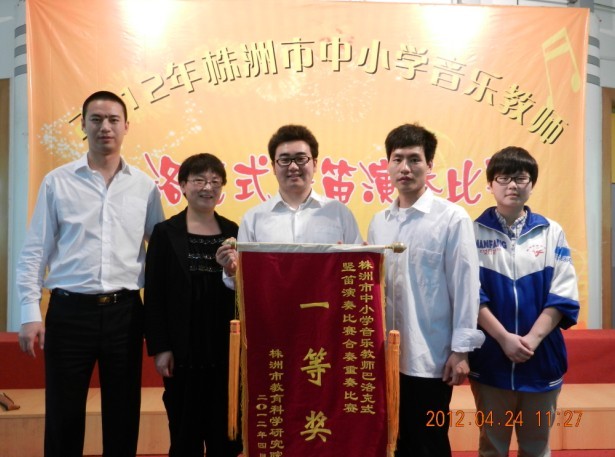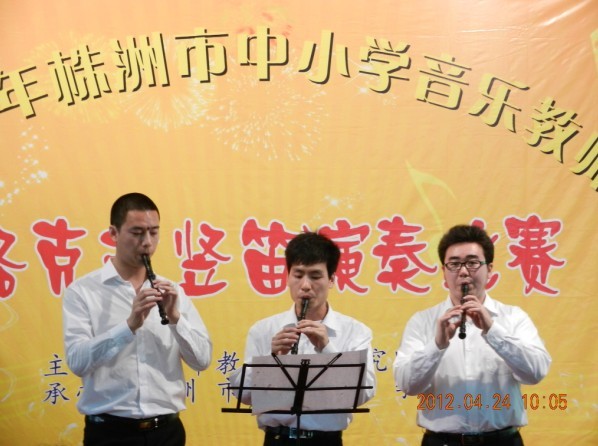 从今天上午刚刚结束的2012年株洲市音乐教师竖笛演奏比赛中传来喜讯,我校三名音乐教师:冯圣昆、韩乔、郭杰鹏排演的竖笛三重奏赢得了所有评委和专家的一致好评,喜获一等奖!