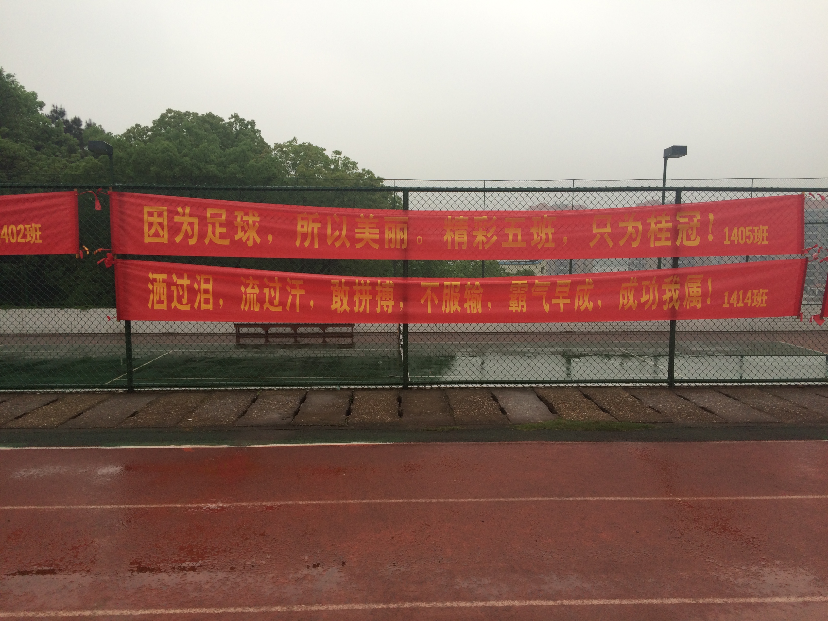 看罢球赛,再看赛场四周各班打出的横幅:“洒过泪,流过汗,敢拼搏,不服输,霸气早成,成功我数”的豪迈,“球员狂笑,球迷尖叫,只是因为,六班驾到”的气势,“因为足球,所以美丽。精彩五班,只为桂冠”的自信,让人不禁为之叫好、为孩子们骄傲:一场足球赛,除了强身健体,除了技艺切磋,孩子们学到的还有很多。