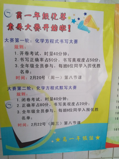 2月22日晚,高一年级全体学生在各班教室举办了化学素养化学方程式书写大赛。