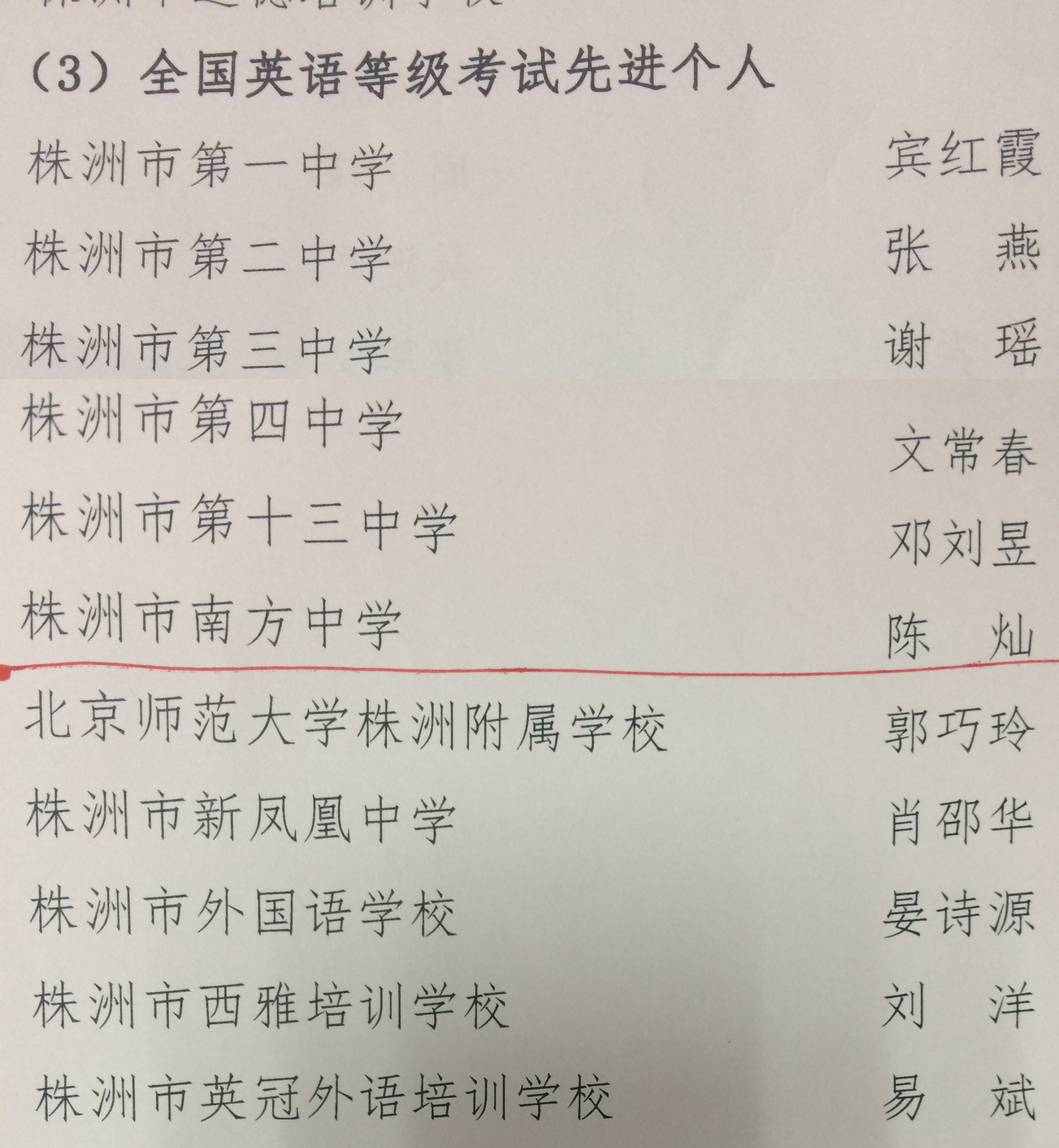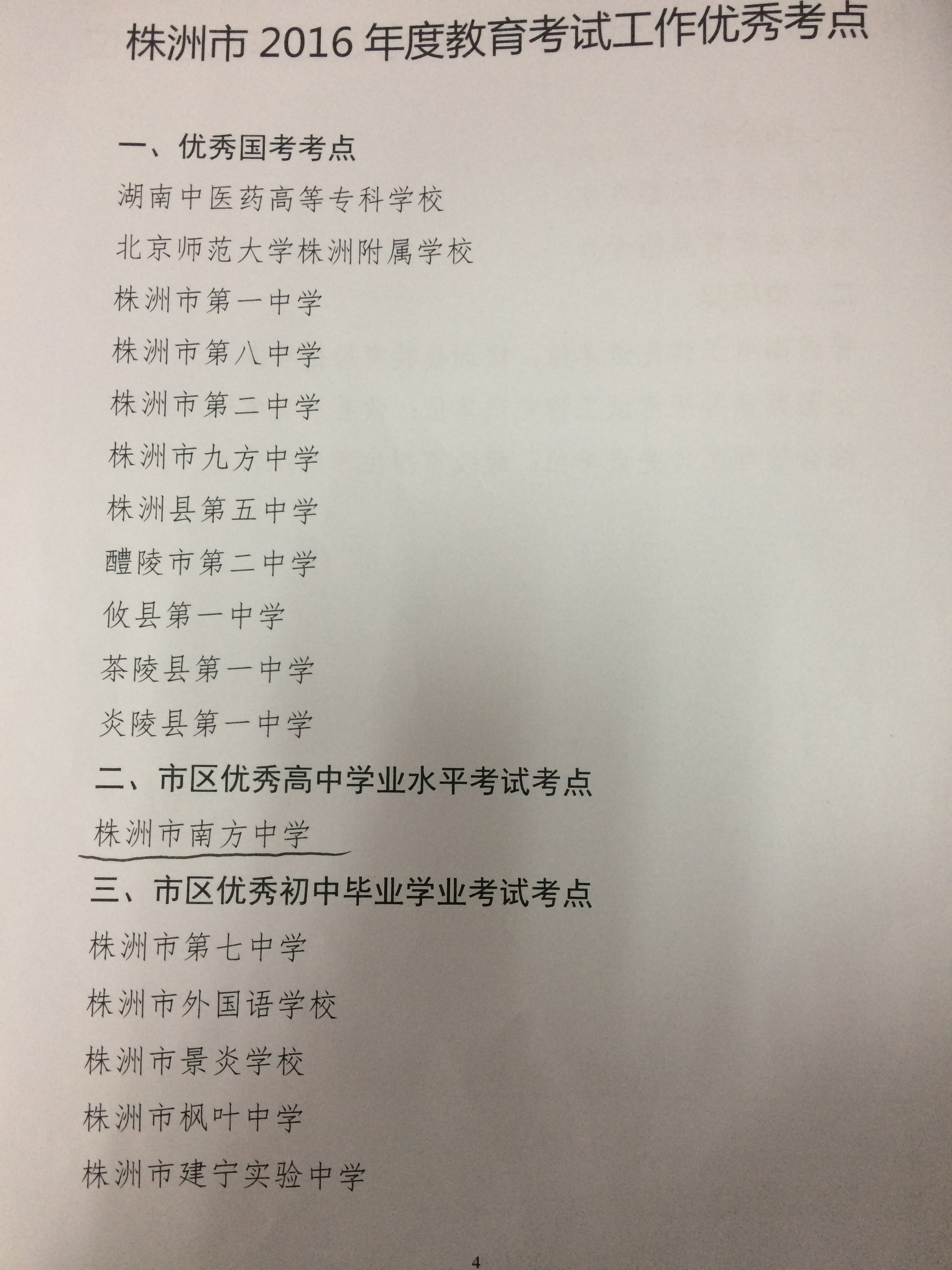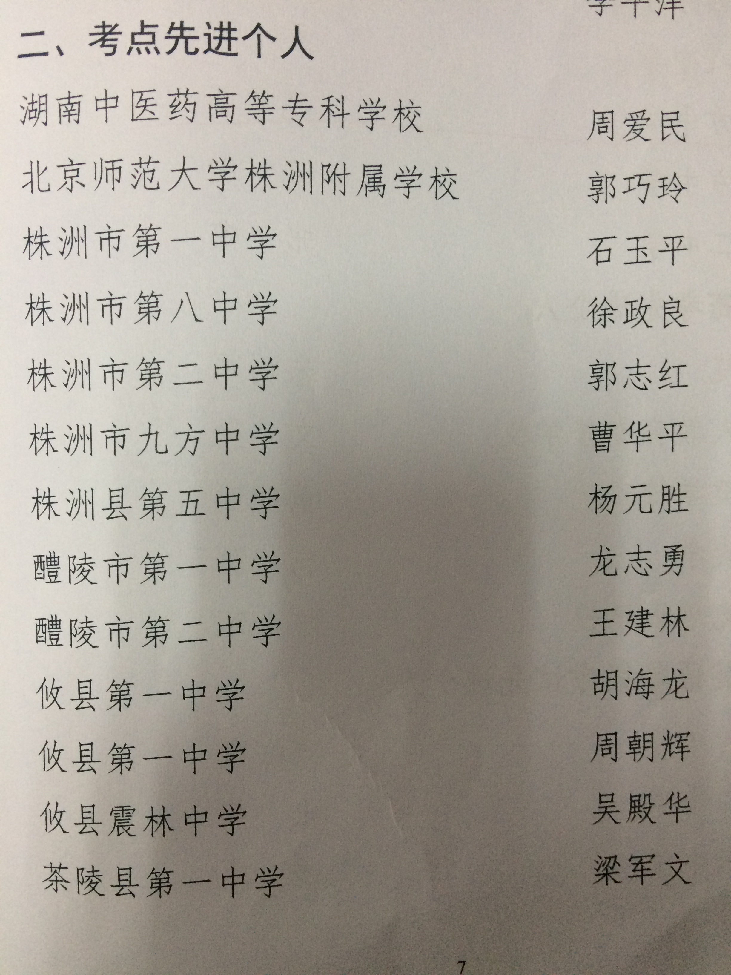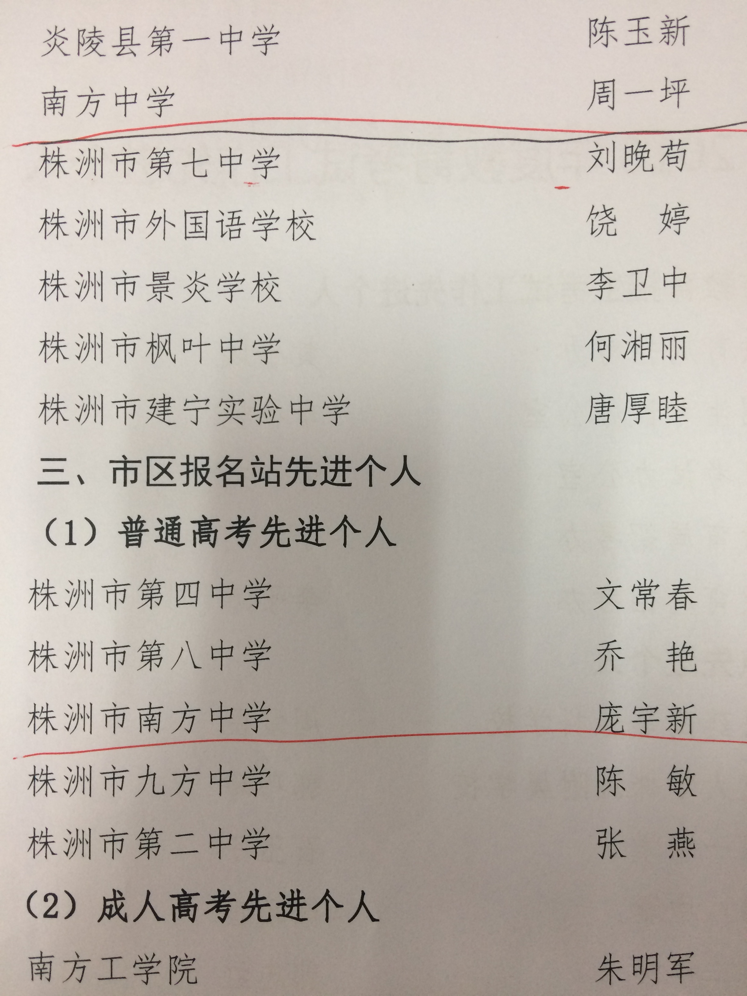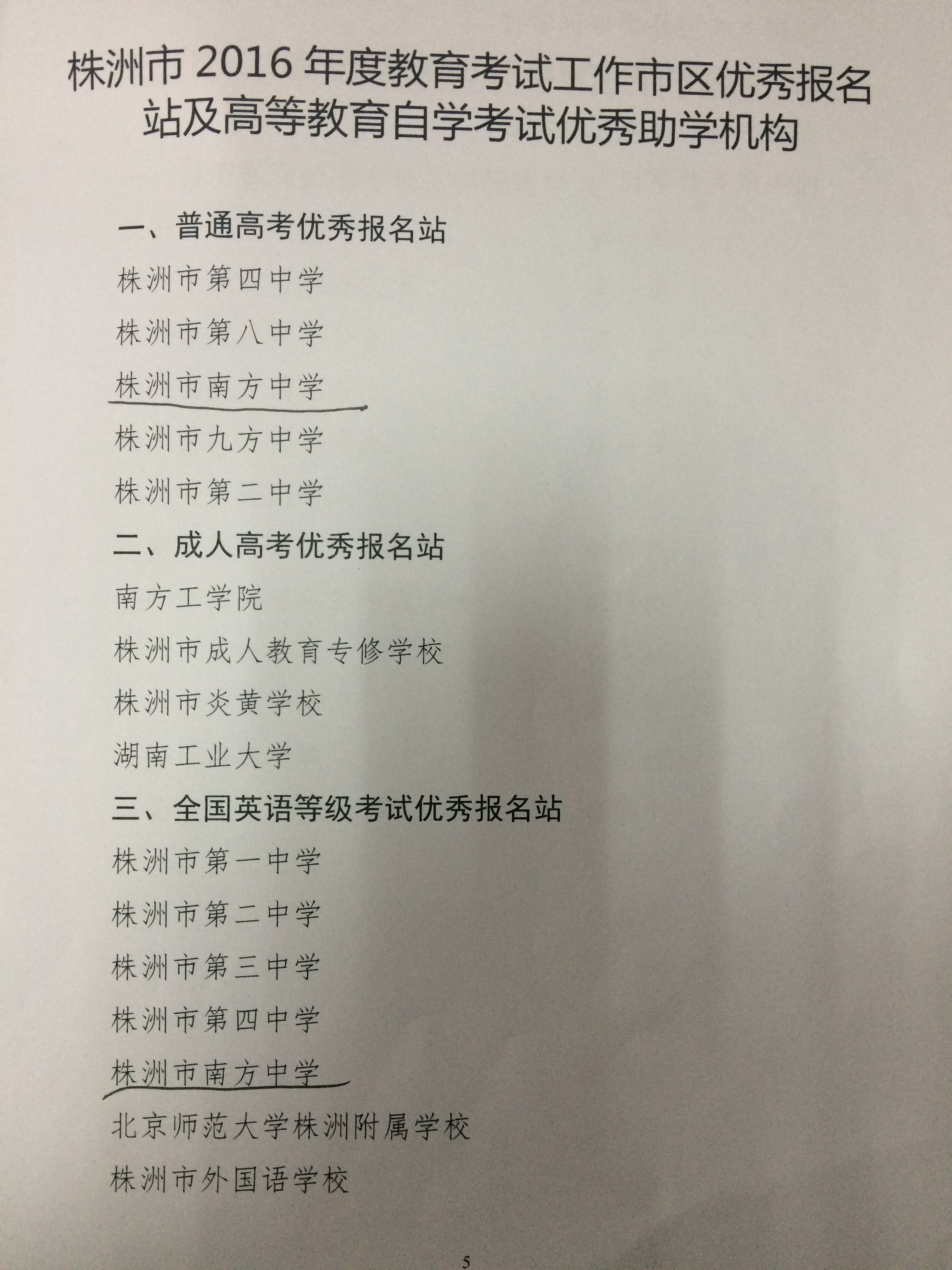 在株洲市教育考试院对各单位的教育考试工作综合考评中,我校获得株洲市2016年度“市区优秀高中学业水平考试考点”“普通高考优秀报名站”“全国英语等级考试优秀报名站”的荣誉称号;教务科科长周一坪被评为2016年度教育考试工作“考点先进个人”,招生办主任庞宇新被评为“普通高考先进个人”,陈灿老师被评为“全国英语等级考试先进个人”。