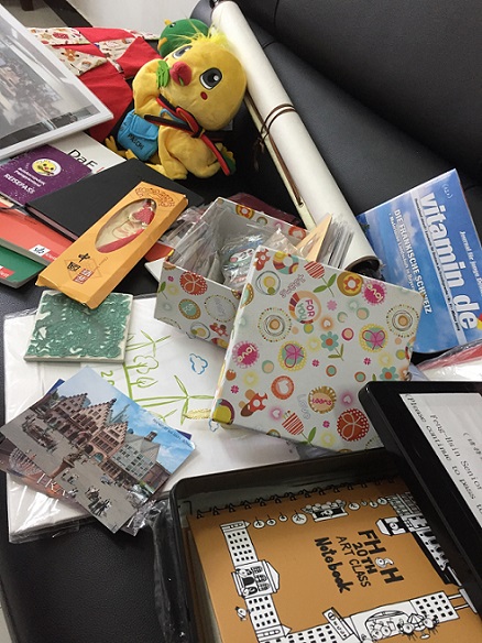 “哇哦……”, 伴随着同学们的掌声,从上一站PASCH学校重庆清华中学寄来装有PASCHi吉祥物的大包裹被两个男生抬进了德语教室。同学们满满的都是期待,焦急的等待着德语老师拆开包裹、打开行李箱……满满的一箱都是小礼物和德语学习资料,当然还有我们这次活动的主角——PASCHi吉祥物的手偶。