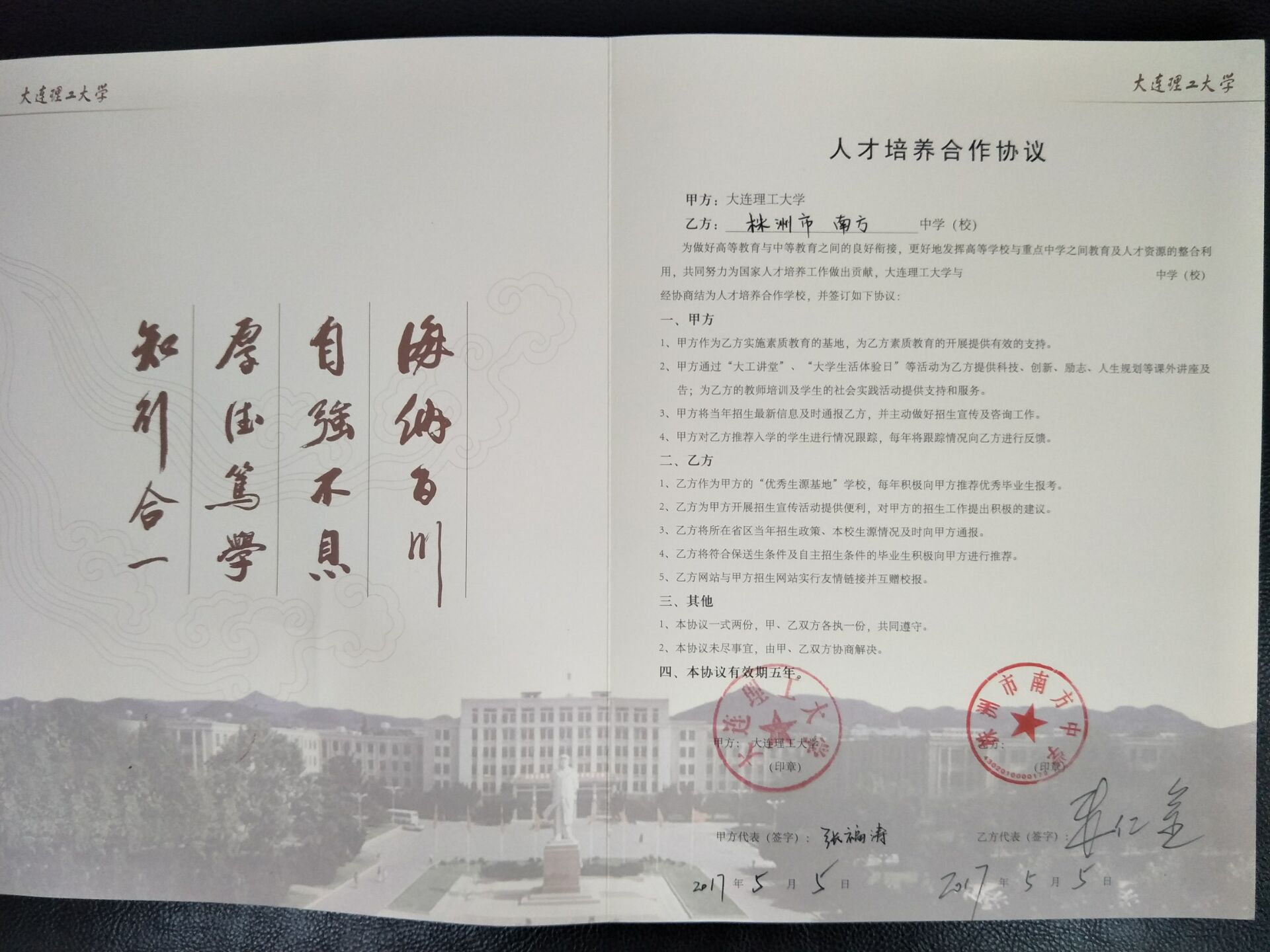 2017年5月5日,我校作为大连理工大学优秀生源基地,继续签订了“人才培养合作协议”,并将请该大学的名师来我校做系列专题讲座。