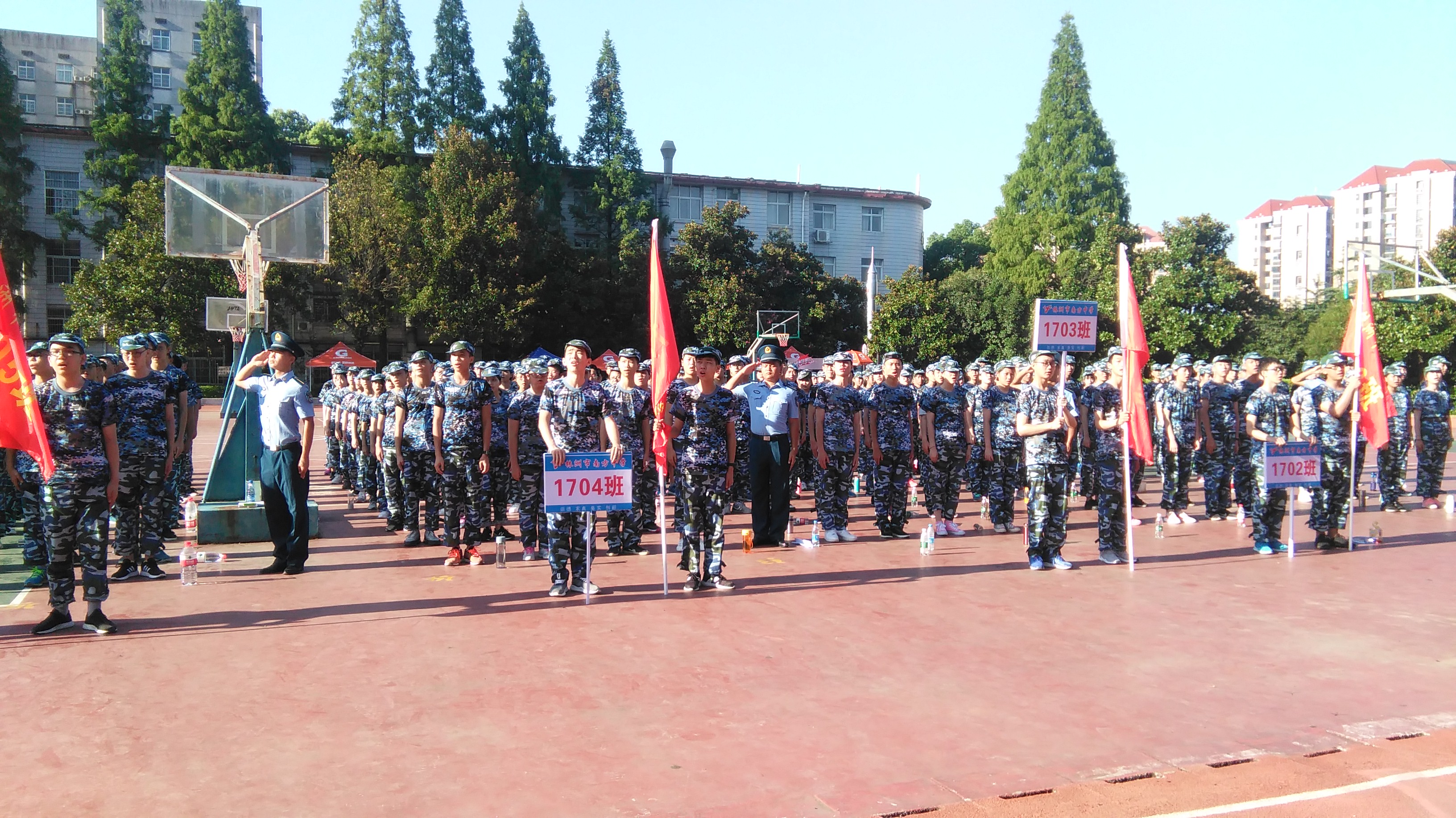 上午9点,南方中学军训开营仪式在塑胶操场隆重举行,军训翟总教官、副校长陈其北、学生科副科长邓必为、高一年级主任戴建平及全体教官、全体高一班主任和全体高一新生了参加仪式。