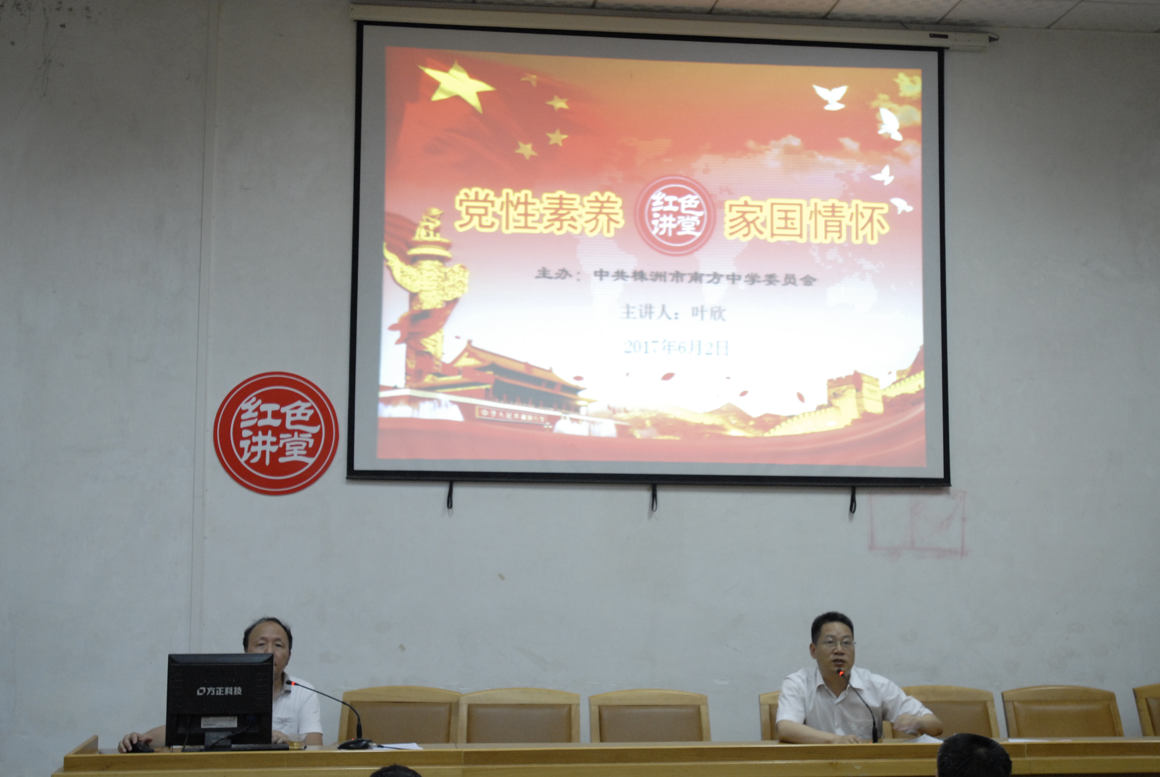 为推进“两学一做”学习教育活动常态化,6月2日下午,中共株洲市南方中学中学委员会按照市委要求,组织所有的党员干部和支部书记参加了“红色讲堂”教育活动。我校德育副校长叶欣同志为大家上了一节名为 《党性素养,家国情怀》的主题党课,校党委副书记、南方中学校长米仁金同志主持会议,并布置了本期主题党日活动安排及相关工作。