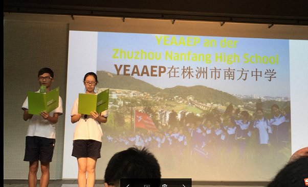 6月25日,南方中学德语老师带领高一年级两个同学参加了在北京798艺术区举行的“青少年环保行动和教育计划YEAAEP”项目闭幕式暨环保体验日。我校从全国21个参与学校中脱颖而出,获得全国“最佳项目奖”;同时,我校两个同学用PPT的形式向在场所有嘉宾展示了我校的环保项目,受到中德双方的一致好评。另外,两位同学还代表我校所有参加项目的同学接受了德国驻华大使夫人Klauß女士授予的“青少年环保大使”证书。