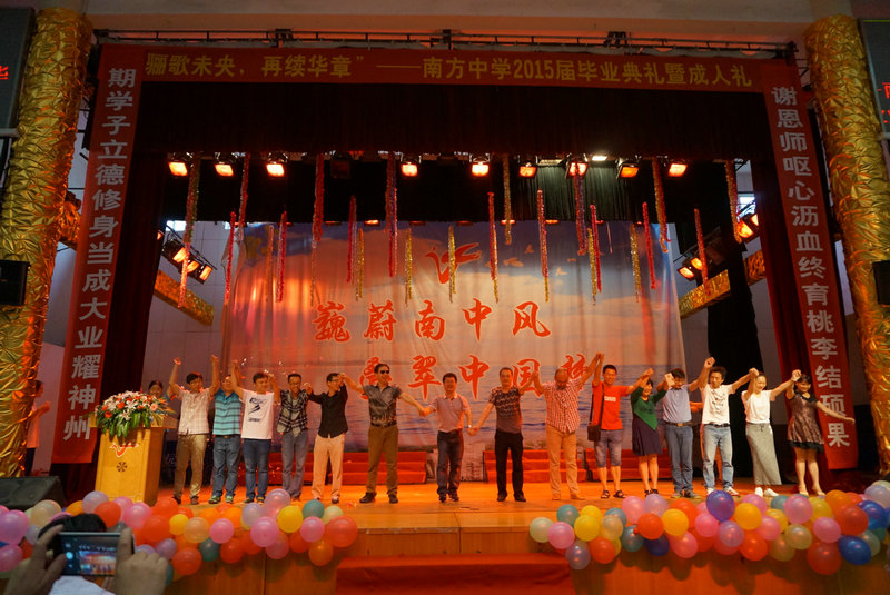 毕业季,成人时。6月9日上午,南方中学体艺馆,主题为“骊歌未央,再续华章”的2015届高三毕业典礼暨成人仪式隆重举行。一个多小时里,既有集体回忆温暖高中生活,也有现场校友互动真情流露,更有成人礼带来的责任和觉悟,600多名高三毕业生离校的“最后一课”成为走向成人的第一步。