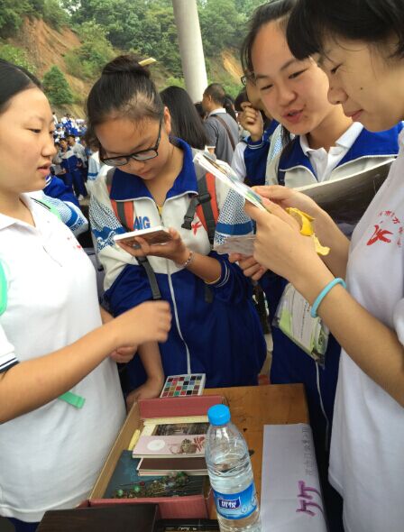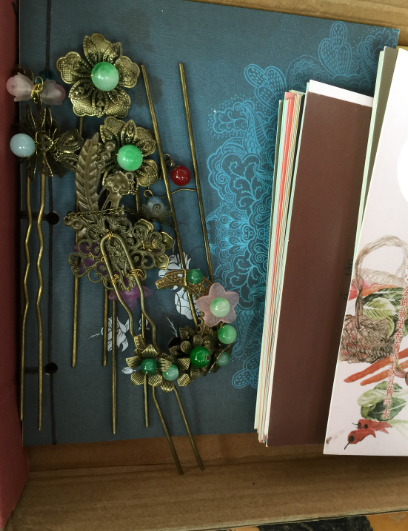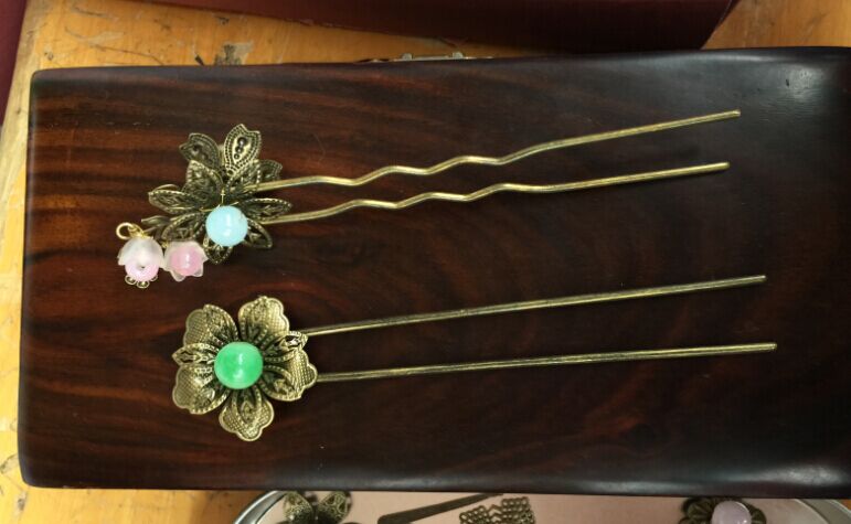 凑近一看,汉学社的成员正在和询价同学讨价还价。旁边一位同学正在手工制作汉朝的头饰。左手拿着头饰的原材料,右手用手工钳把各种琳琅满目的配饰用铁丝串起来。制作发饰的同学来自高二的朱晓金,是汉学社的创始人之一。朱同学向我们介绍了她的手工成品,有发簪、发梳、还有各种头饰。制作一个简单的头饰需要半个小时,复杂的需要一个小时。汉服社的成员会把制作出的发饰售给喜欢的同学当作社团的经费,维持社团活动的正常开展,体验劳动所得的快乐。