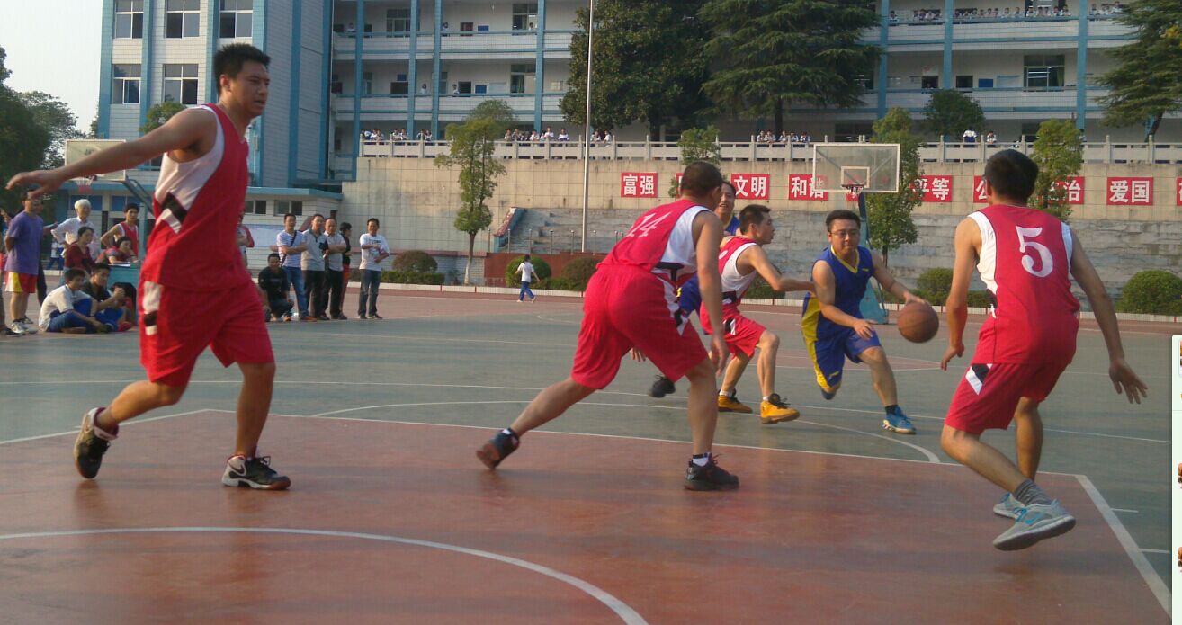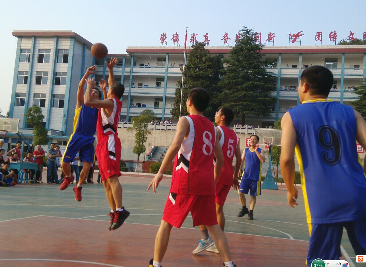 昨天的比赛为高一对机关。两队实力相当。从身高看,机关队超1.8米的有袁建文、韩乔、葛文贵。高一队有邓必为和谭雄杰。其中袁建文老师为本期调入我校的信息技术老师,身高、速度、弹跳超群,篮下优势明显,成场上球迷追逐热点。 高一队的矮个子刘瑾行如脱兔,投篮精准,频频得分。机关队矮个子王宏标动作敏捷,出手快、得分多,亦是场上的“风云人物”,高一老队员邓必为频现3分远投,赢得阵阵喝彩。比赛打得难舍难分,比分总成胶着状态。最后机关队以37:35胜于高一队而首战告捷。