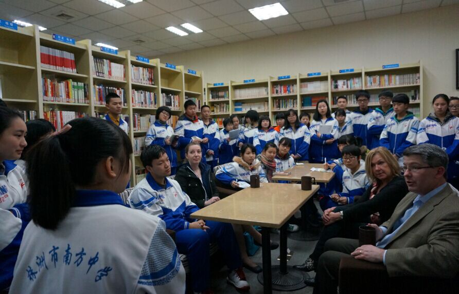近两年,南方中学与美国奥尼尔学校有着较为密切的交流与合作。2014年4月,奥尼尔中学校长Mr.Elmore在湖南省、市外专局领导的陪同下对南方中学进行了实地考察与访问,对学校给予了高度的赞扬,并立即签订了包括课程共享、师资交换和学生交流等友好合作协议。2015年年初,10名南中学子赴美进行十天的跟班学习。他们入住美国爱心家庭,与美国奥尼尔小伙伴通吃同住同行,全程参与奥尼尔中学的各项活动。3月中旬,奥尼尔中学校长、数学部主任、国际部主任一行三人再次访问南方中学,两校今后就引进优质课程体系、编写和开设国际理解教育校本课程、建设国际理解教育教室、提升校长和教室队伍的国际视野、双方互派教师交流、开展专业教师技能培训五个方面的深度合作。5月4日,南方中学8名教师走进奥尼尔中学,学习和感受美国先进的教育及文化。2016年初,奥尼尔中学的学生将对南方中学进行回访,他们将入住学生家中,跟踪中国课堂教学,参与学校的各项活动。目前学校正在与奥尼尔中学就下一步的学生交流进行洽谈。