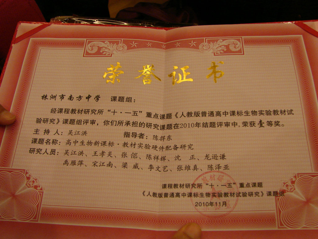 11月份,我校吴江洪老师和王孝炎老师参加了教育部课程教材研究所在益阳举行的《普通高中生物教材实验研究》课题结题、成果鉴定及颁奖会议。我校荣获教育部课程教材研究所课题成果一等奖。