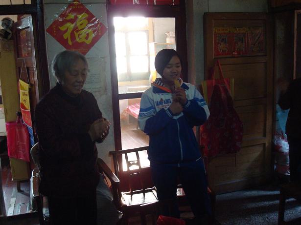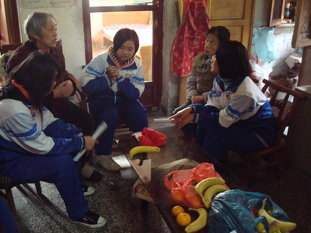 一大早,由20人组成的志愿者队伍分成四组,拎着代表心意的水果,走进团结村徐全福奶奶家、新华一村龚雪娥奶奶家、和平村徐教英奶奶家和新华三村李奶奶家。敲门,问好,表明来意,主动要帮忙做家务,和老人拉家常,给老人唱歌,志愿者的礼貌、朝气和热情深深感动了这些孤独老人,老人那已有些浑浊的眼睛闪烁着慈祥的光芒,发自内心的喜悦洋溢在脸上,也感染了每一个志愿者。慈祥和蔼的老人们婉言推辞着志愿者们打扫卫生的志愿服务,在她们看来,能有这么多可爱的孩子们来看望自己,关心自己,已经深感欣慰了。她们和志愿者促膝谈心,或回首曾走过的人生路,或谆谆告诫孩子们爱惜身体好好学习,或讲述自己笃信了一生的佛法理念……美好的时光总是短暂,一个上午的时间转眼就过去了,志愿者们依依不舍的离开老人们的家,并相约以后还去看望她们。