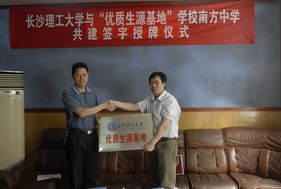 6月13日,长沙理工大学副校长李明教授一行4人来到我校,与我校签订共建协议书,并授牌我校“长沙理工大学优秀生源基地”。