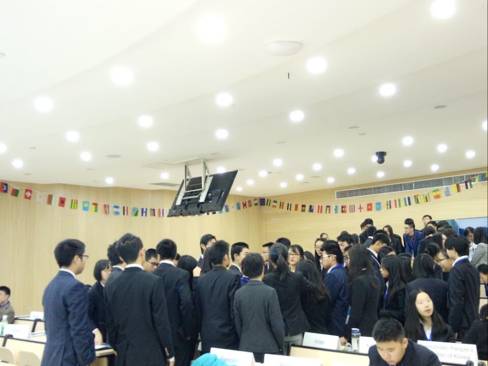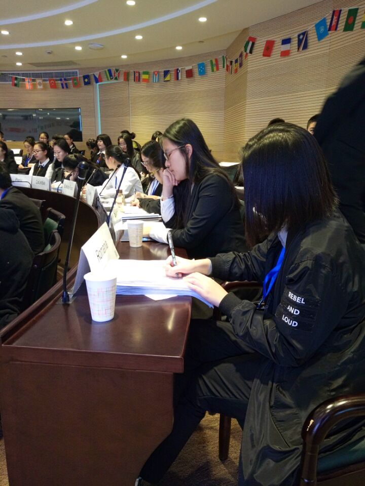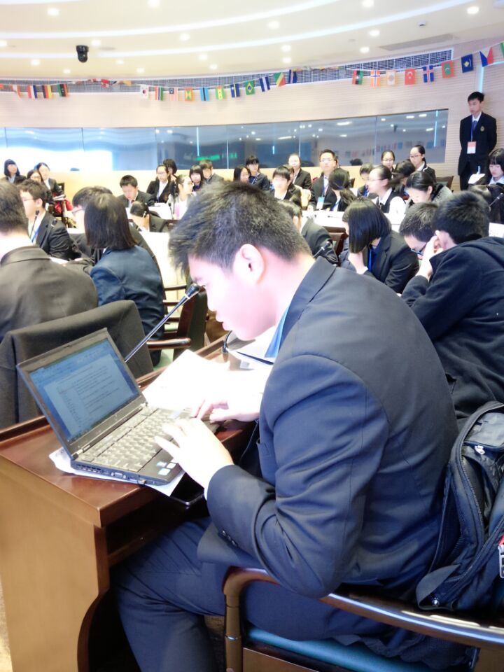 在四天的会议期间,我校学生边学习边模拟。每次会议前,我校学生团队合作,利用网络,建立QQ群,共享各会场信息,积极抢占会场的中心位置。在会议中,他们努力克服语言的某些障碍,及时做笔记,举起国家牌,或动议或进行即兴演讲。每位学生基本在各自会场发过言,且有几位学生多次发言。自由磋商阶段、会前交流阶段、会后休息时间,我校学生积极结交各国代表,协助构建各种联盟或利益集团,积极参与决议草案的起草;第一次参与国际间的模联活动,虽然我们还有几分羞涩,但是我们收获了友谊,增长了见识,开阔了视野。