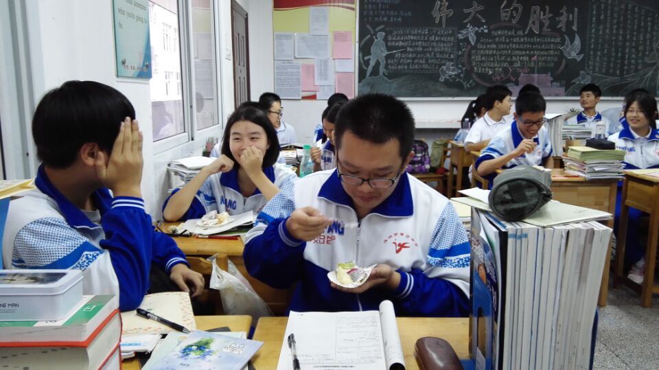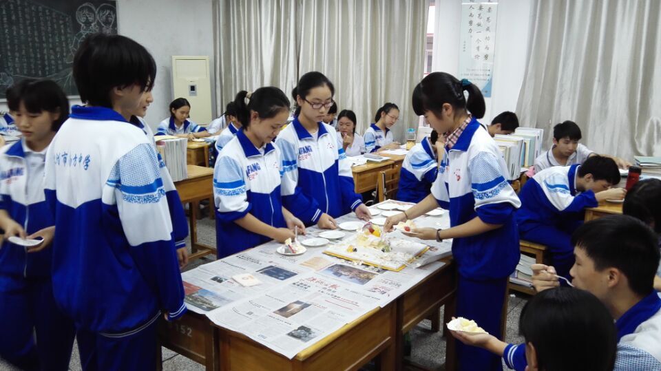 9月21日下午第八节课,2015级高一六班的教室里其乐融融,弥漫着蛋糕的香味,他们正在举行收场生日会,为八、九月份过生日的同学庆生。