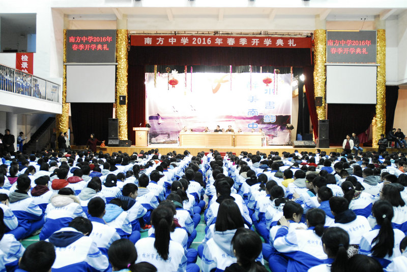 2016年2月22日下午4时,南方中学2016年春季开学典礼在学校体艺馆隆重举行。南方中学2000余名师生参加了开学典礼,本次仪式由学校德育副校长叶欣主持,米仁金校长致开学典礼辞,吴刘光明书记宣读先进集体和先进个人表彰决定,陈其北副校长宣读奖学金获得者名单。