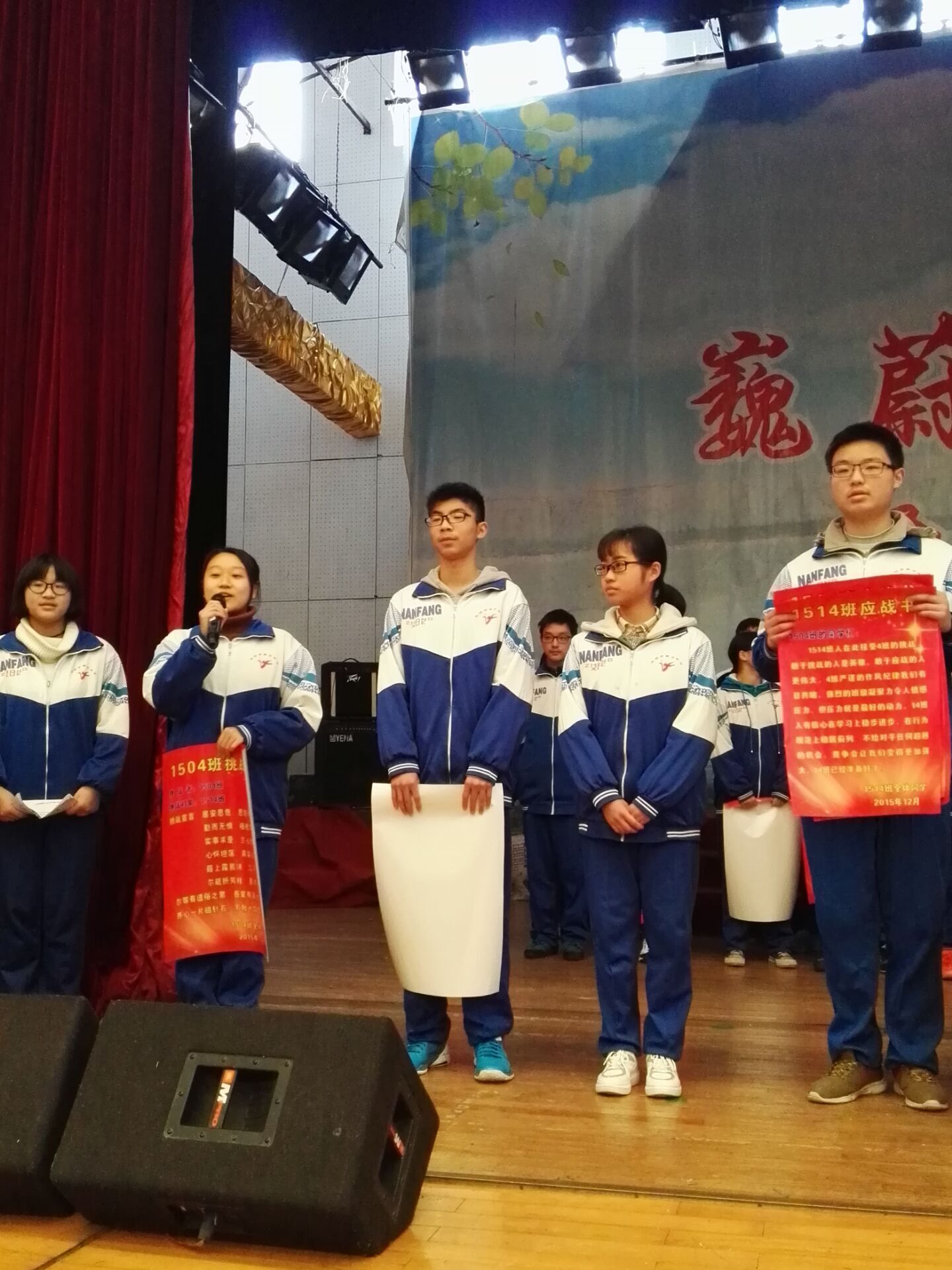 本次大会最引人入胜的是班级挑战环节。每个班派代表向自己要挑战的班级发表挑战宣言,对方应战后交换挑战书和应战书。这个过程里,有比较温和的交接,如1505班对1501班的应战就是:“感谢1班同学对我们的挑战!”兄弟般的对手让人心里一暖。也有正儿八经的,如1502对1504宣言说:“我们向4班挑战!”1504答曰:“我们时刻准备着!”还有睥睨挑战对手的,如1509应战1505的宣言是:“你要战,我便战,我有兄弟千万,何惧尔等草率!”挑战宣言恶搞的也有,1506挑战1502即是,“1506,666!1502,222!”顿时全场的氛围就活跃起来。1509班由于前几次考试居于英才班第一,受到了四个班级的挑战。这种挑战方式让各个班级都有了自己追逐的目标,争着向先进班级学习,努力提高自身水平,也强化了学生的集体荣誉感。