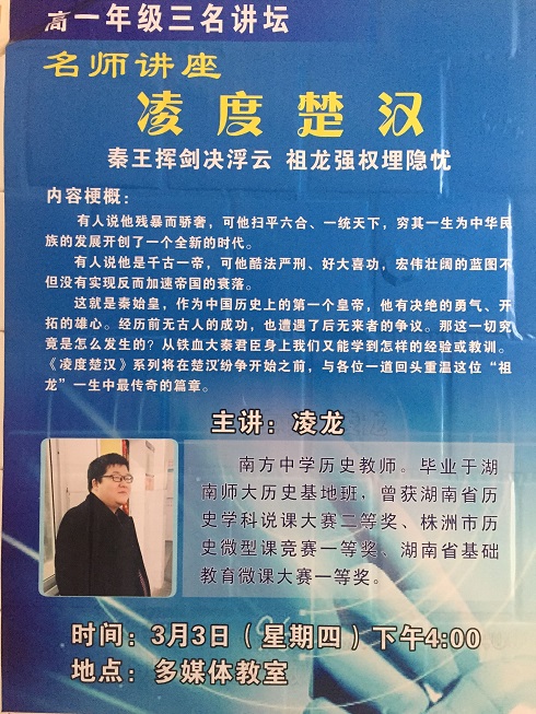 3月3日下午四点,南方中学多媒体教室内座无虚席,连过道上都挤满了学生,使得春暖时节的温度又升高了不少。是什么如此吸引学生呢?原来是高一年级历史组才子凌龙老师的“凌度”系列之二——“凌度楚汉”开讲啦!上学期凌龙老师开设校本课程“凌度两宋”,深受学生喜爱,被评为优秀校本课程。