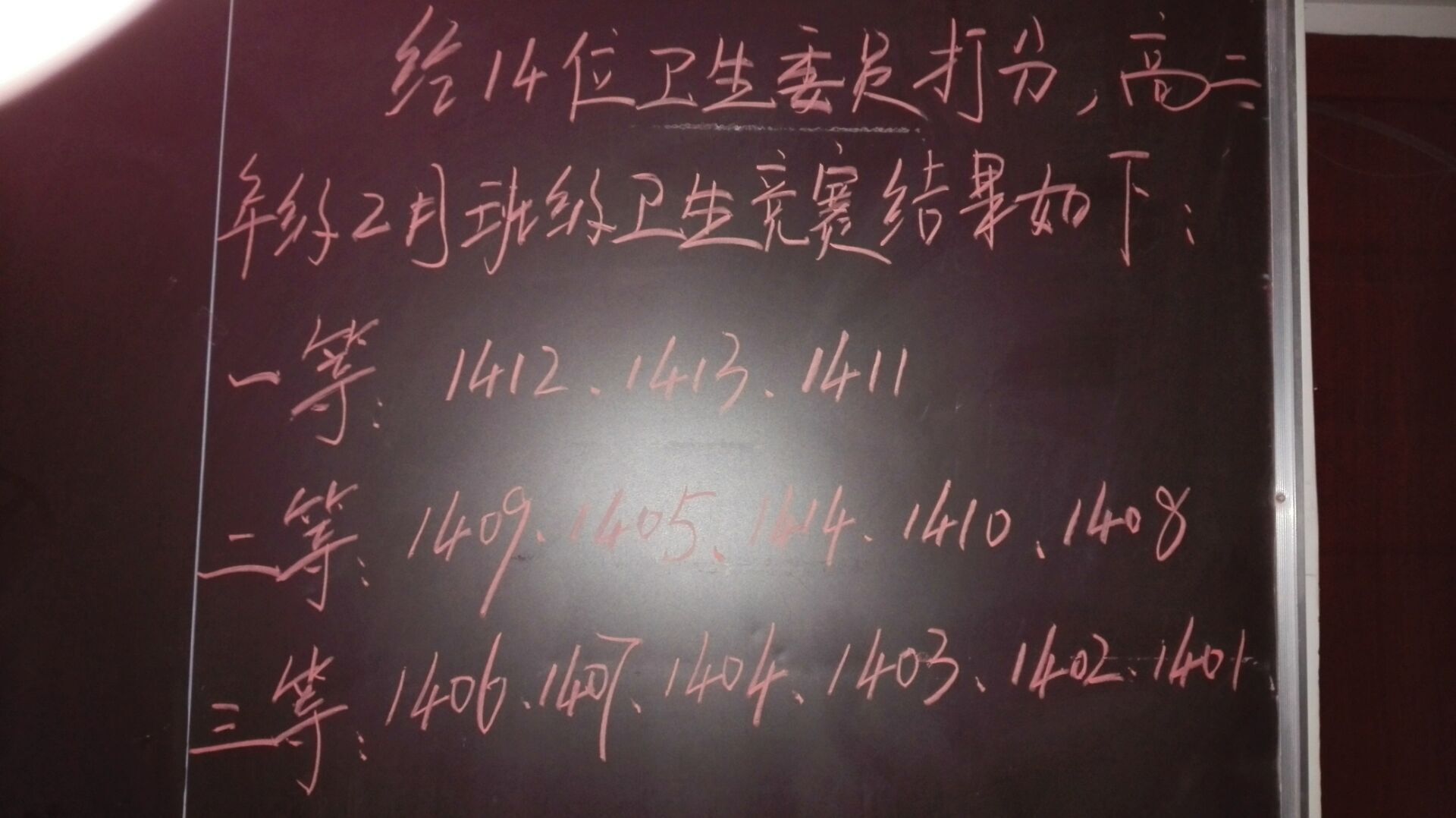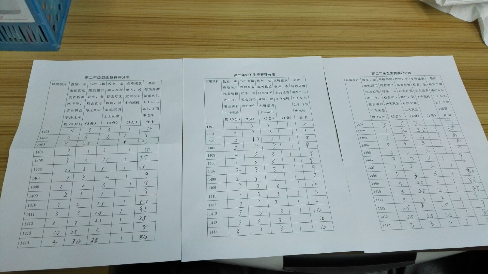综合14位卫生委员的打分结果,评出一等奖1412、1413、1411,二等奖1409、1405、1414、1410、1408。结果并不是最重要,最重要的是各班卫生委员作为亲身参与的一份子,从一个管理者的角度观察、体会班级卫生状况,从而反馈到各个班级、实现精细化管理这一过程!