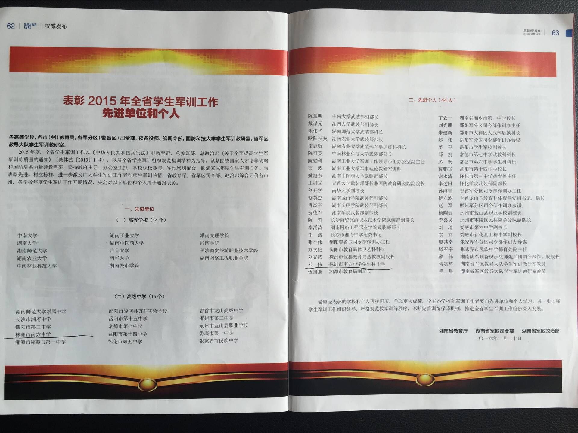 近日,2015年全省学生军训工作先进单位和个人的评选结果揭晓,南方中学喜获全省学生军训工作先进单位荣誉称号,成为全省15所评先进的中学之一,也是株洲地区唯一一所获此荣誉的中学。同时,我校邓伟老师喜获先进个人的荣誉称号。
