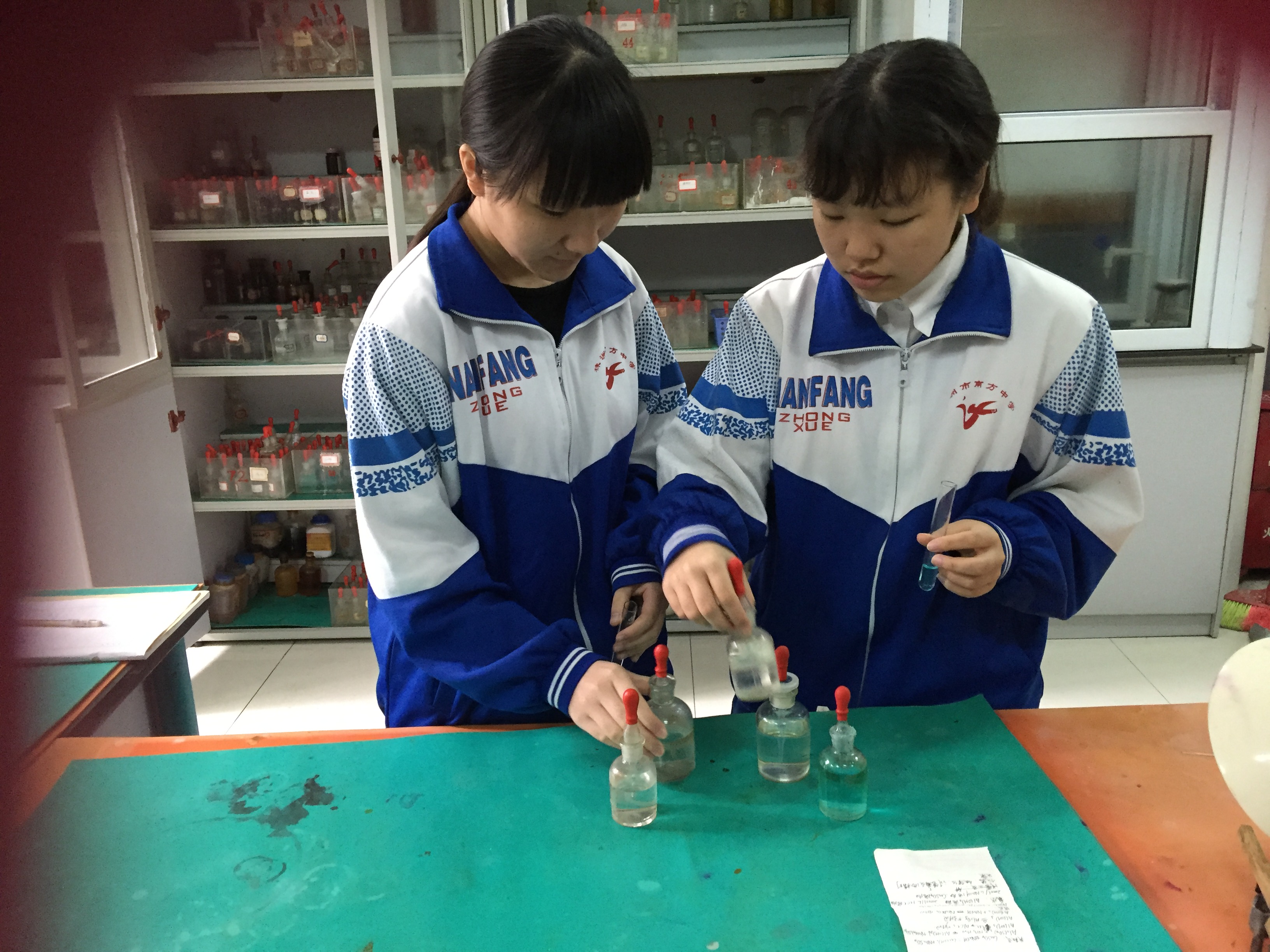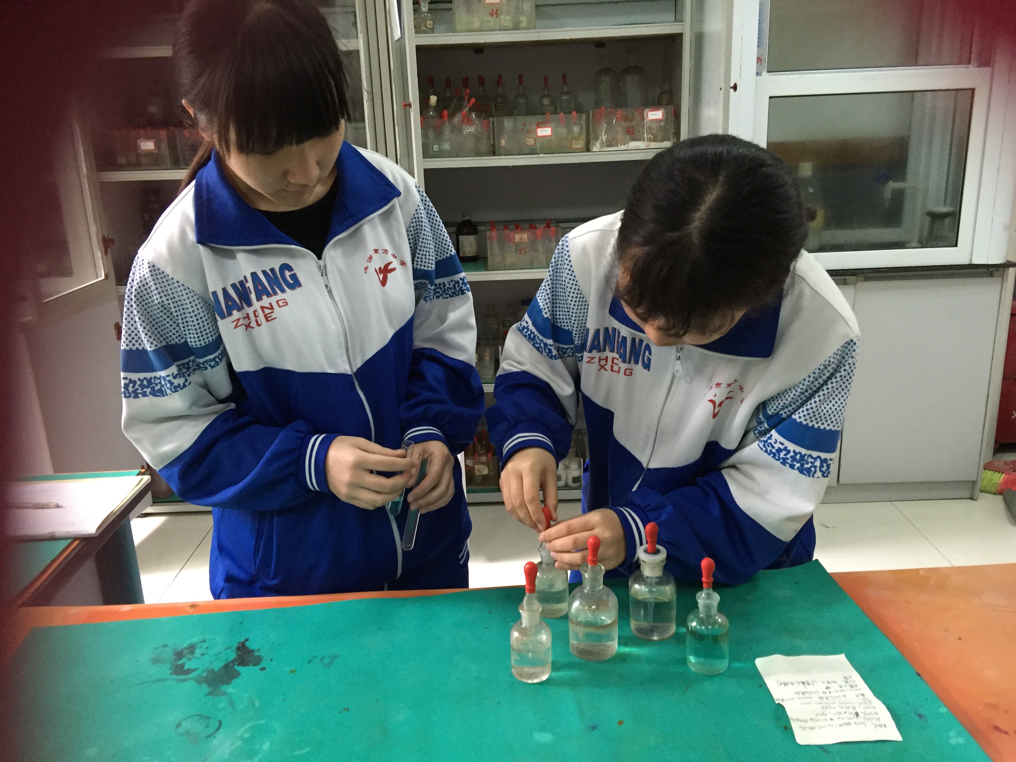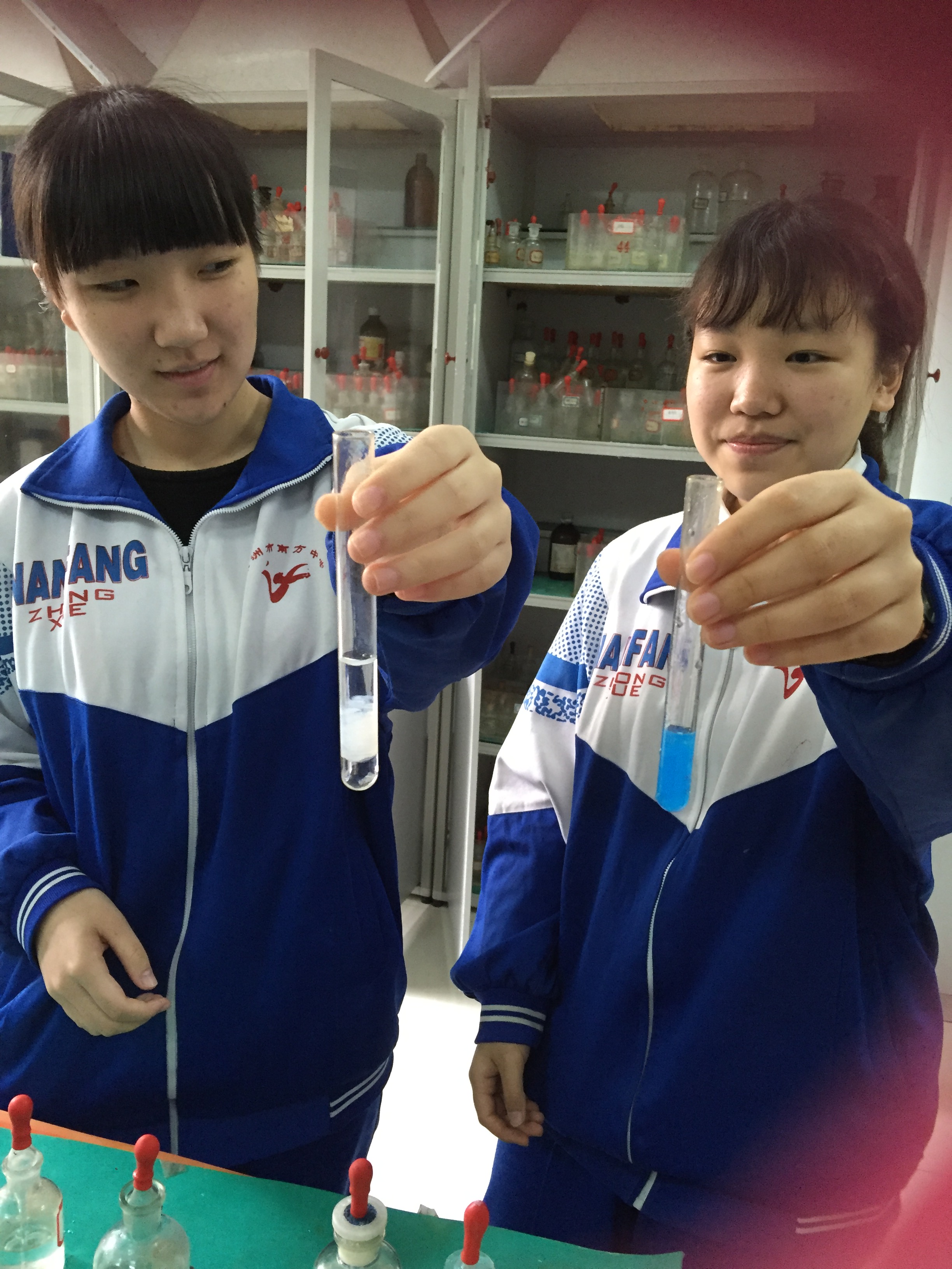 下午来了两位女同学,她们是高一年级1513班的陈思伽和樊思蕊,她俩把提前做好的实验方案给我一看,我立马为她们提供了所需的实验仪器和试剂。她俩起先比较生疏,滴液的时候,滴管伸进了试管中,手也颤抖,还自嘲地说:“老师,我们好紧张的!”没多久,两位同学就逐渐熟练了起来,当看到自己制出的白色絮状氢氧化铝沉淀和蓝色氢氧化铜沉淀时,兴奋地说:“哇!好漂亮!”然后在里面加入酸和碱,发现氢氧化铝全部溶解,氢氧化铜只溶于酸。实验成功后,她们很有成就感,并且像老师一样总结到:“氢氧化铝是两性的,氢氧化铜是碱性的。”