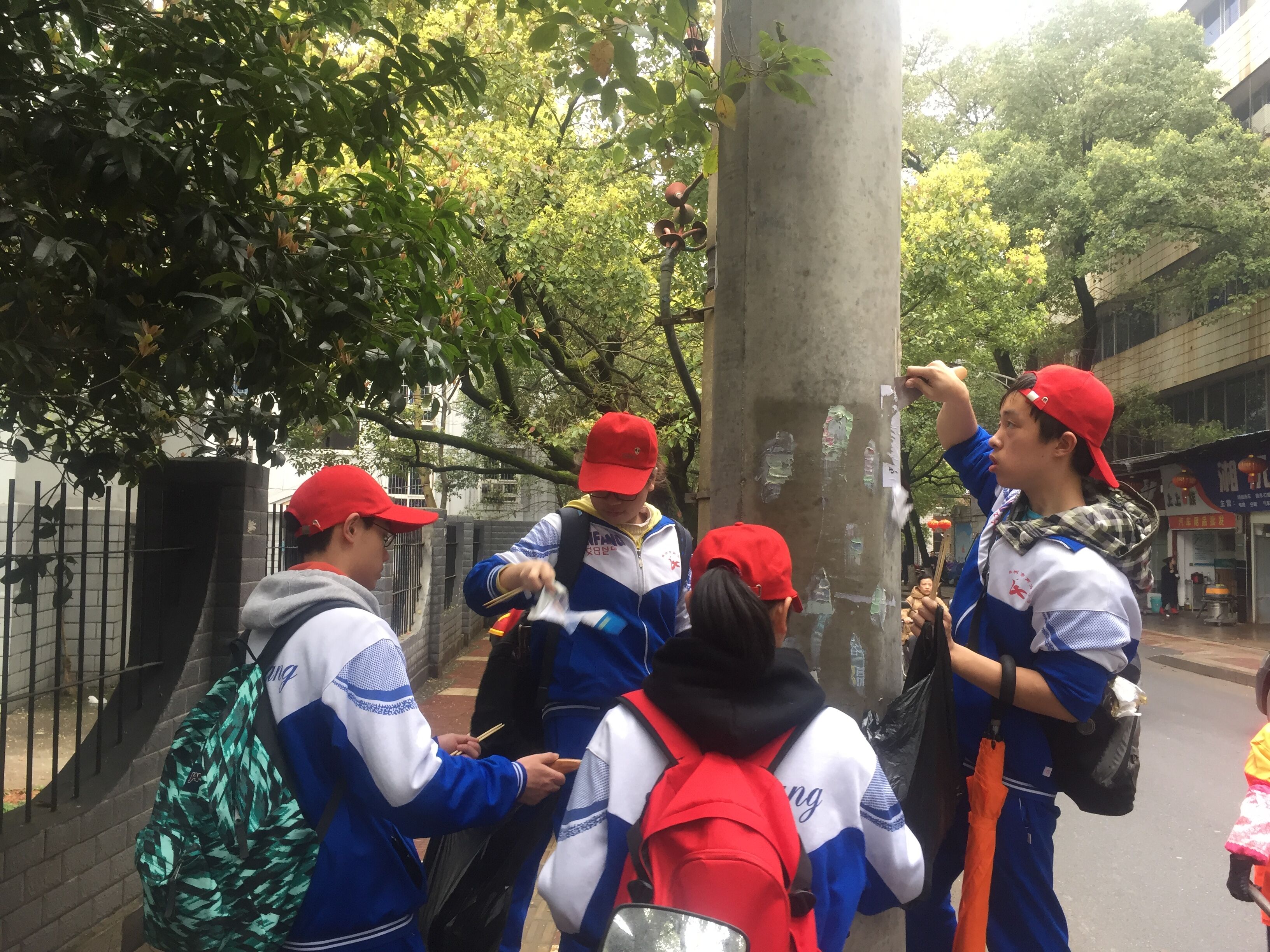 工具是垃圾袋和筷子,还有社区借来的小铲子。对于牛皮癣,志愿者们各显神通:手撕、筷子戳、铲子铲;对于地上的垃圾,志愿者们不放过任何一处:大到广告篷布垃圾,小到烟头纸屑,统统清理。同学们一路上或弯腰前行,或踮脚劳作,不畏脏不惧苦,与垃圾和牛皮癣“死磕”,路上行人都投来赞赏的目光。