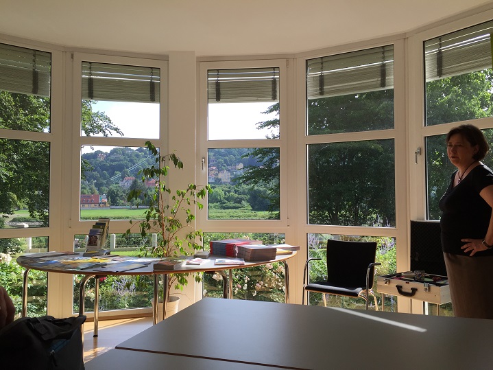 经过30多个小时途径长沙、北京、杜塞尔多夫的转机和等待,10日傍晚终于到达了历史文化古城德累斯顿。住宿地点位于德累斯顿老城区的一个老别墅区,研讨会的教室就在宾馆的一个会议室,风景非常优美,巨大的落地窗外就是美丽的易北河。到达之际,正逢举行欧洲杯最后几场球赛,在宾馆附近啤酒园的露天电视直播场,见到了来自克罗地亚、乌克兰、俄罗斯、巴西、塞尔维亚、丹麦、希腊、印度、西班牙、土耳其、法国、斯洛伐克和爱美尼亚等13个国家的德语老师以及歌德学院的研讨会领导。