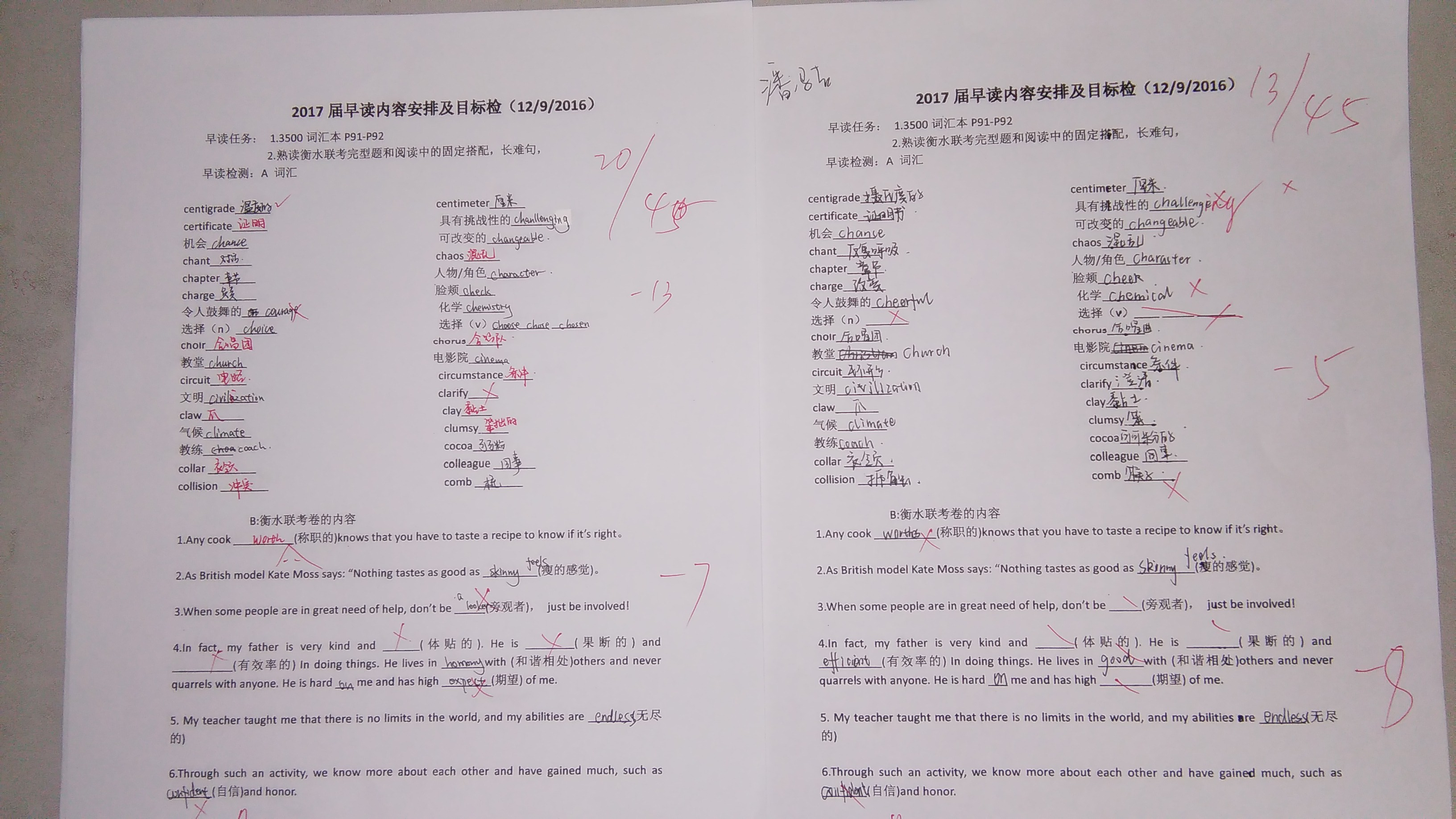 高三年级本期以来形成了一种有明确目的,有实际检测的早读机制。每周的早读时间语文、英语备课组都会下发当天早读的具体任务和检测内容。要求学生在早读时按照具体任务进行早读,并且在早读结束前10分钟开始对按早读任务对学生早读的效果进行检测。任课教师的任务则是对早读进行监督和对学生早读检测进行批阅、讲评。这样,学生的早读就有了明确的目的,有了老师的监督和对早读效果的检测,从而更好地提高了早读的效率。