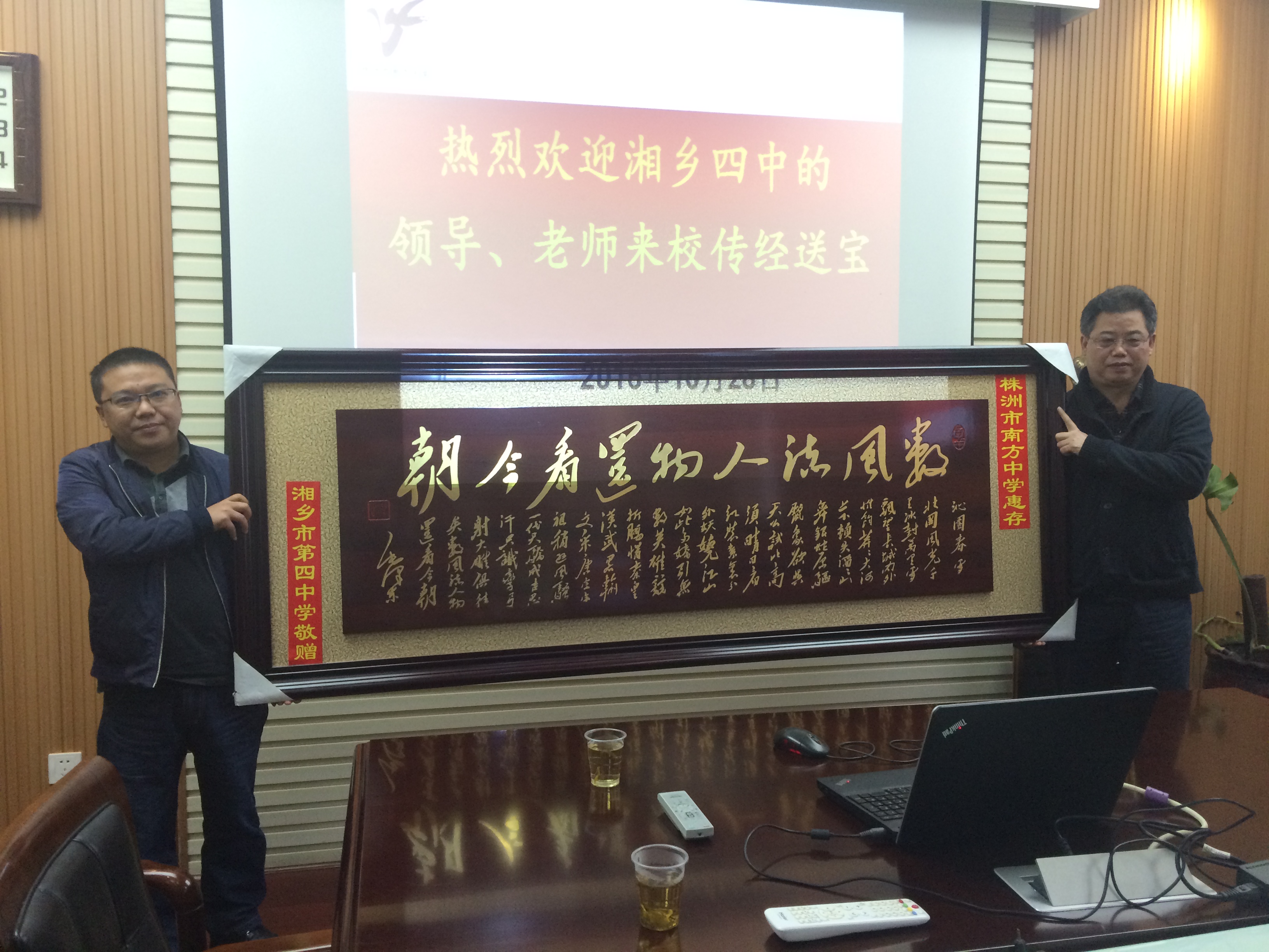 上午第二三节课,湘乡四中老师们观摩我校高三年级所有文化科目的课堂,并于第四节课分备课组交流两校的备考策略,第五节课我校举行欢迎会,由教学副校长谭志忠致欢迎辞并介绍学校基本情况。湘乡四中赠与我校一块牌匾,上书:数风流人物还看今朝。