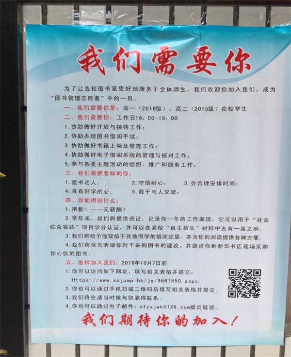 基于师生共建知识殿堂的需要,2016年9月,借图书室搬迁契机,教务科启动了“图书管理志愿者”的招募项目。期望一批爱读书、有见地,且乐于接受新鲜事物的孩子能在图书管理的过程中既为他人服务,又让自己有所收获。经过两周的招募,共有2个年级30名同学报名参与,愿意承担为他人服务,为学校奉献的责任。接下来的时间里,他们将分时在图书室、“清心轩”担负辅助借阅、整理图书、接待读者、维持秩序等工作。学校也将会为其提供聆听讲座、借阅限额增加、参与采购图书等机会。