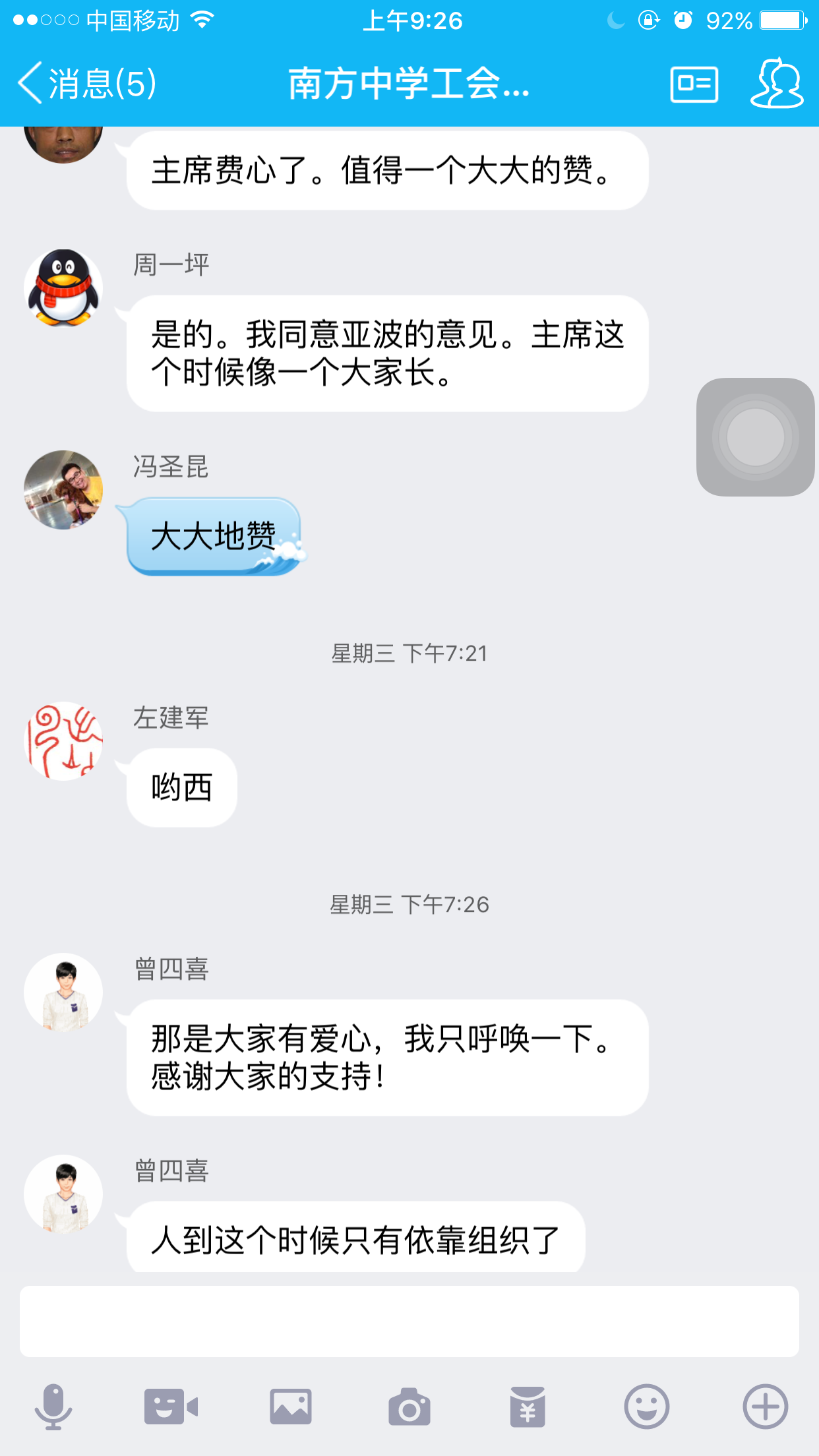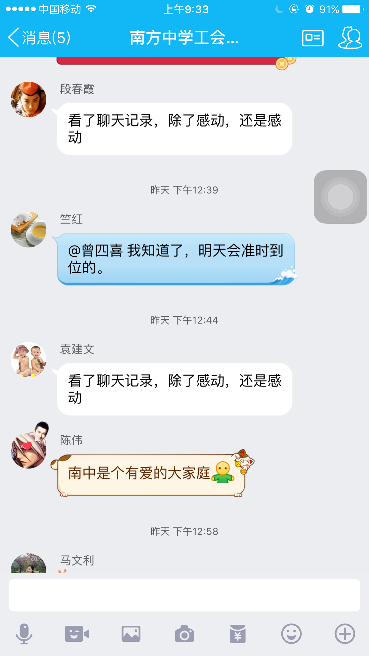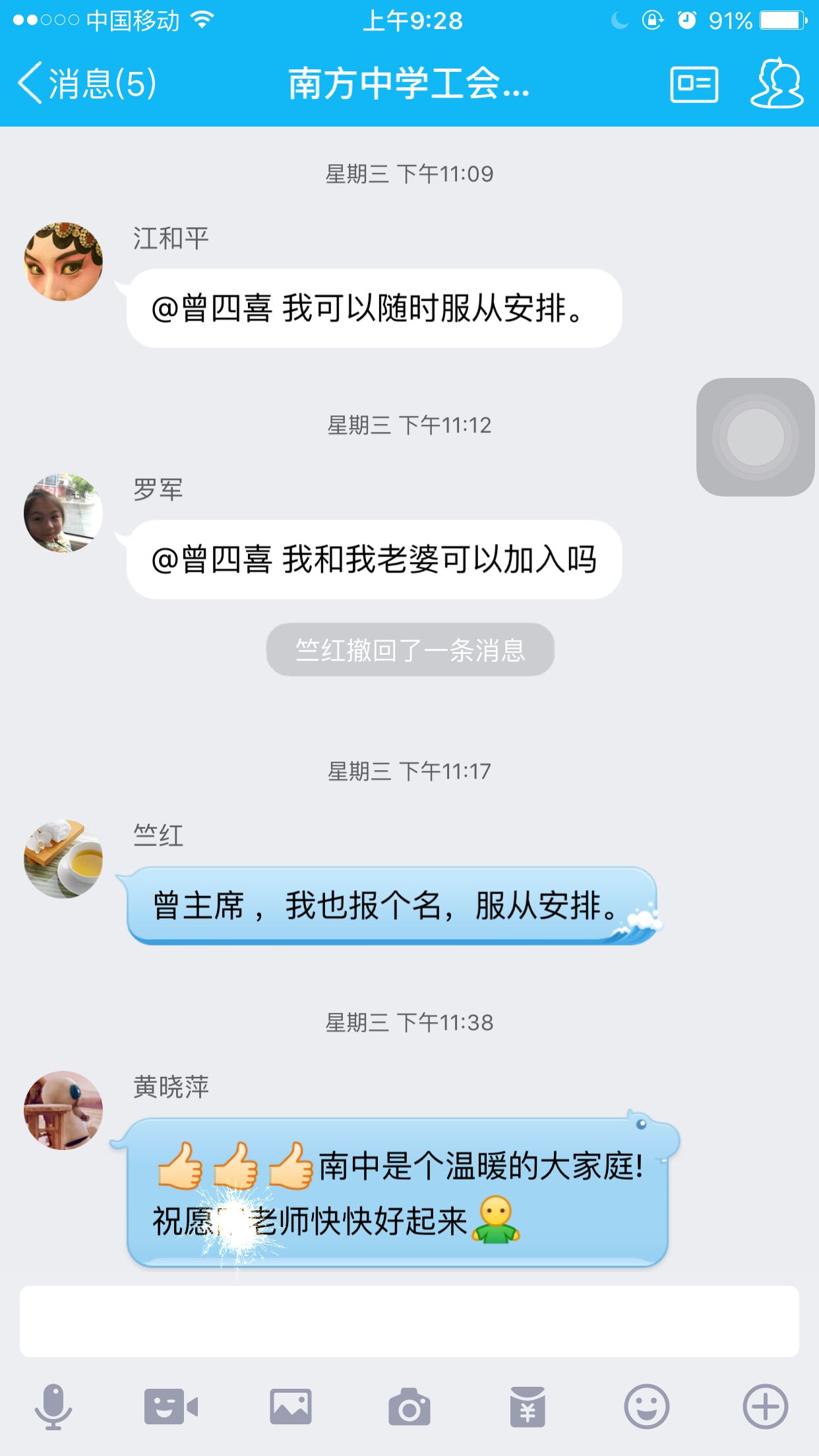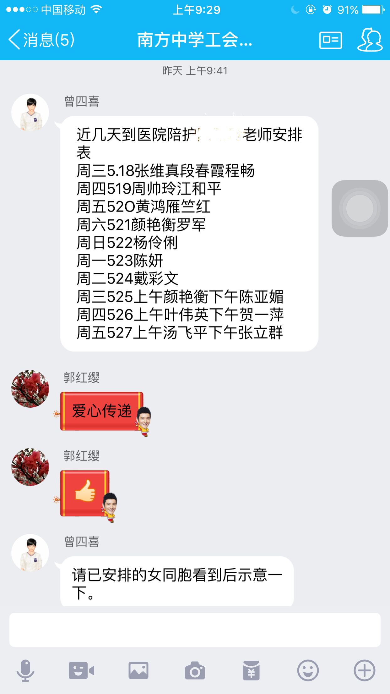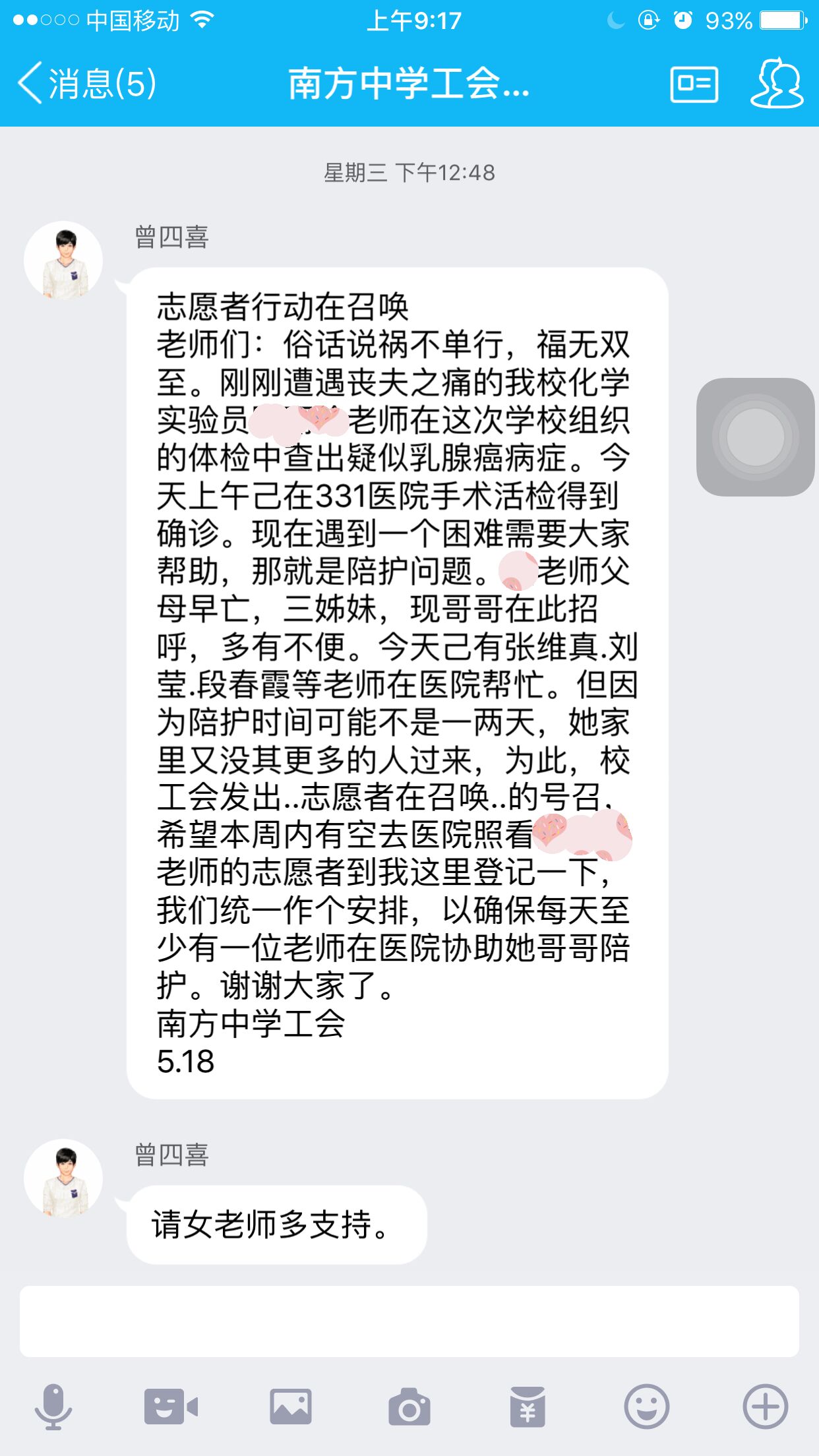 南方中学工会主席曾四喜在学校的工会群里发表了一段这样的话,“南中姐妹,心存良善,手手相扣,传递温暖。她虽不幸,风雨共担,同事情深,八方点赞。”打开南方中学工会群,发现这两天群里的老师异常的活跃,争先恐后要照顾患病住院的同事李玲(化名)老师。