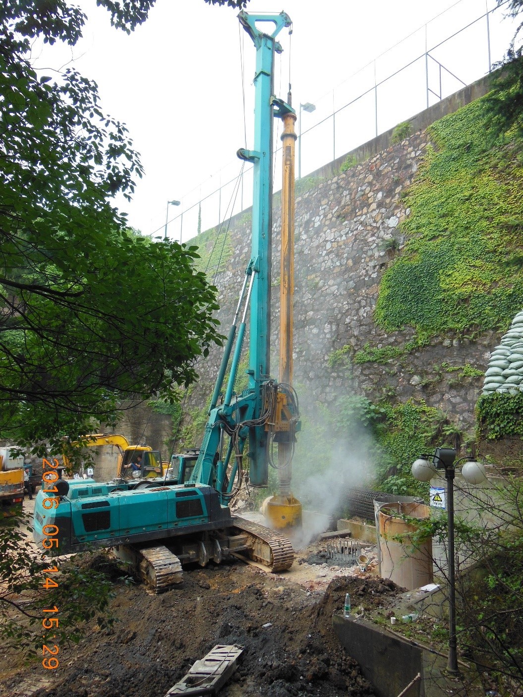 施工过程中,我们采用“旋挖机”等先进设备,提高施工人员的人身安全系数,保证工程施工精度。确保后山运动场排险工程安全、高质量施工。