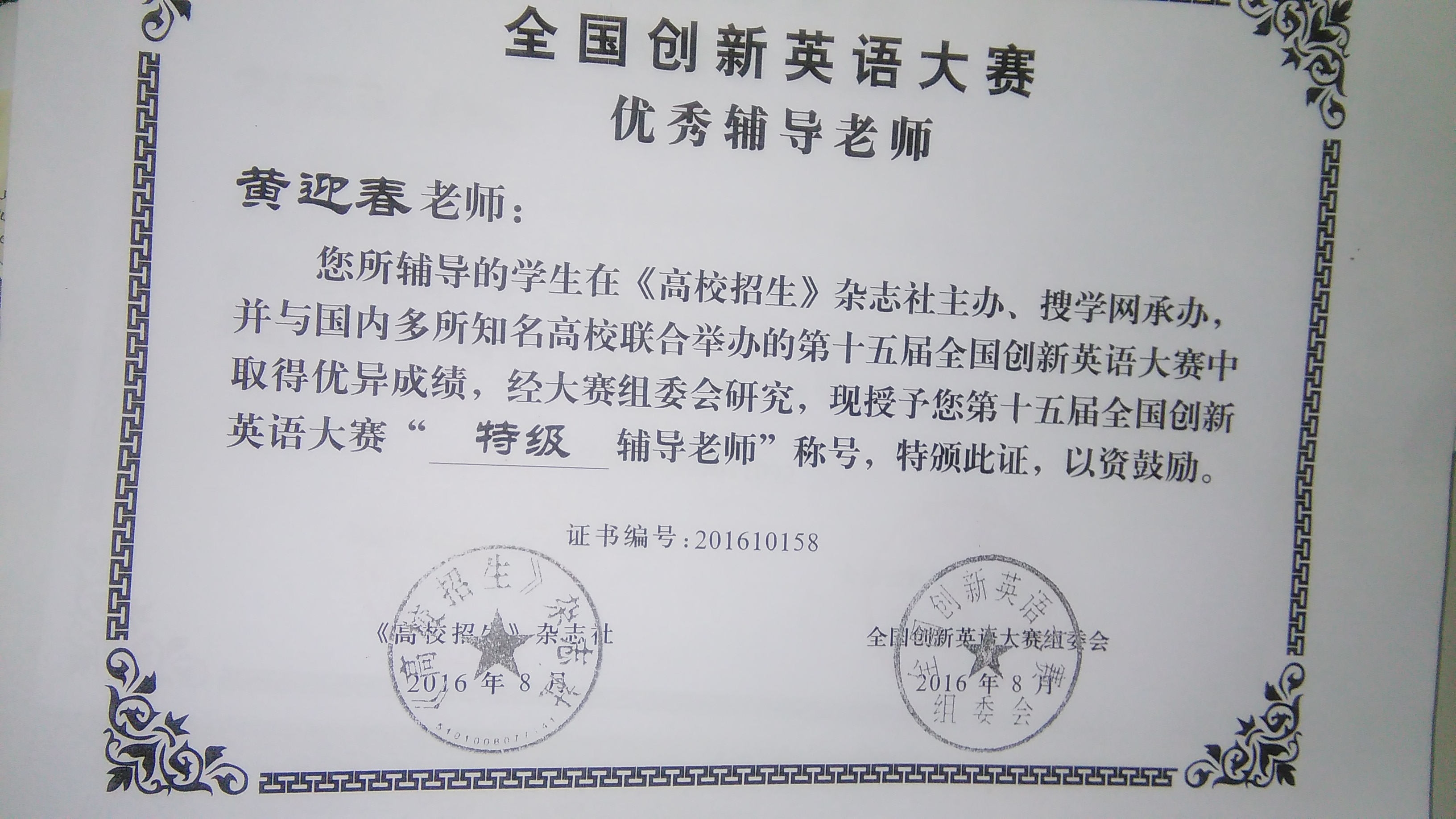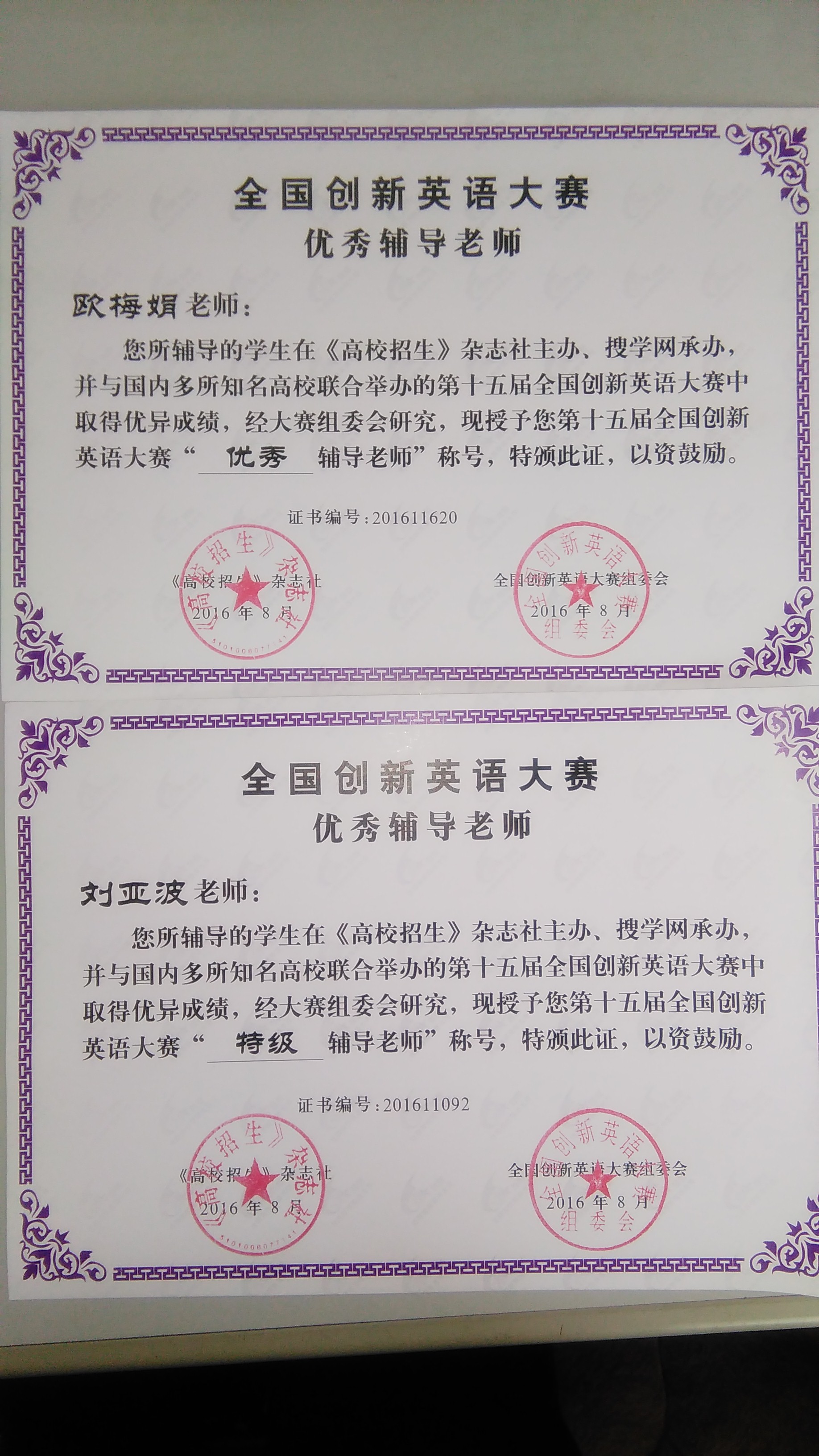 第十五届创新英语大赛学生参赛结果很早就公布了。我校学生取得了骄人的成绩——一人获得全国一等奖,两人获得全国二等奖,两人获得全国三等奖;还有六人获得华中赛区一等奖,四人获得二等奖,五人获得三等奖。而最近,教师获奖公布了,我校高三黄迎春、刘亚波二位老师获得“特级辅导老师”称号,欧梅娟老师获得“优秀辅导老师”称号。虽然付出不求回报是我们南中教职员工共同的特点,但是这些奖项的获得是对英语老师们努力的一种肯定。