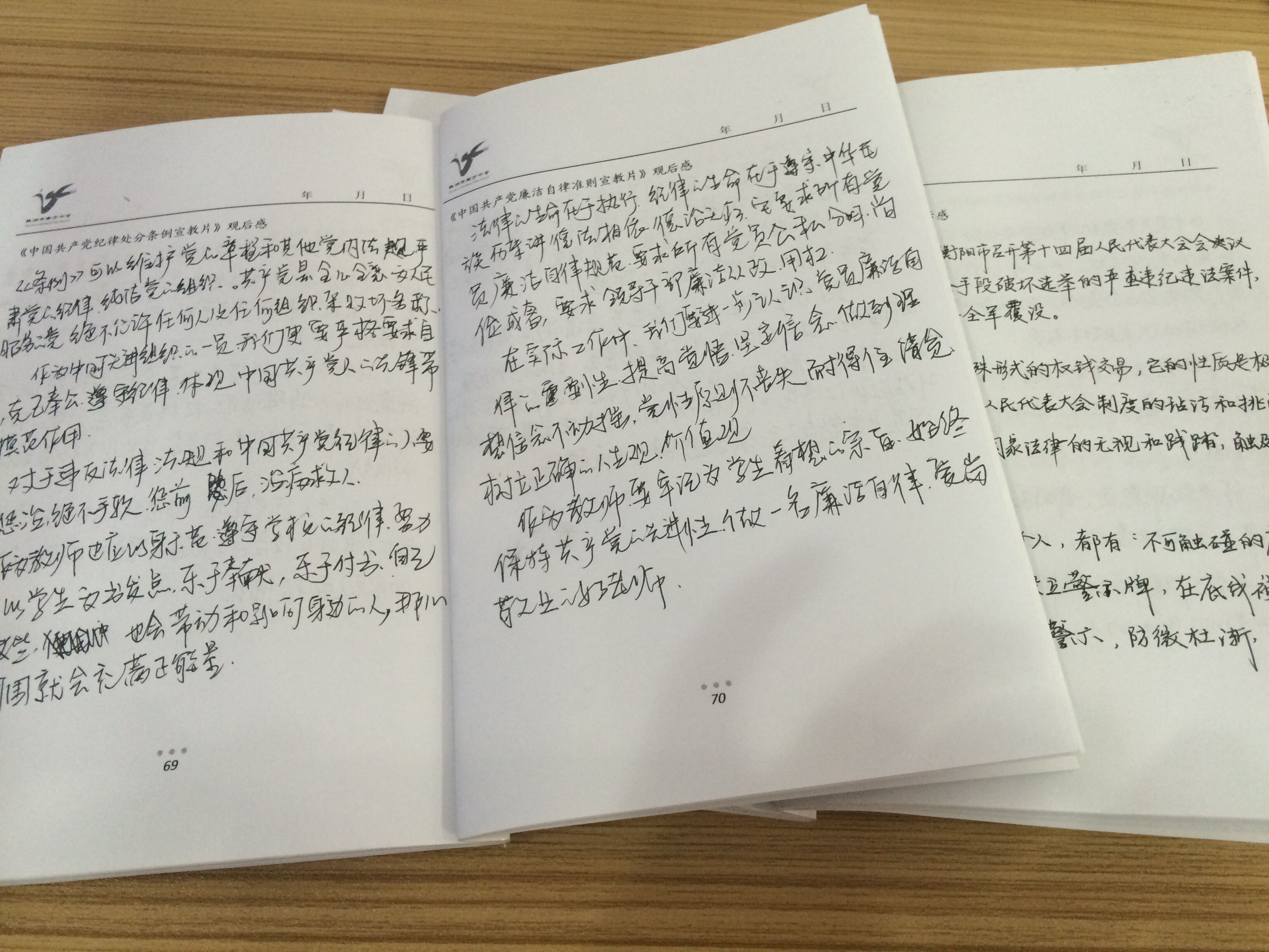 随后,大家一起观看教育警示片《不可触碰的底线》,并在《学习手册》上记录了自己的观后感。本片主要讲述了衡阳市召开第十四届人民代表大会会议期间发生了以贿赂手段破坏选举的严重违纪违法案件,一届市人大代表几乎全军覆没。大到社会国家,小到个人,都有“不可触碰的底线”,我们需要给自己的底线设立警示牌,在底线被触碰前及时给自己或他人以警示,防微杜渐,绝不盲从。