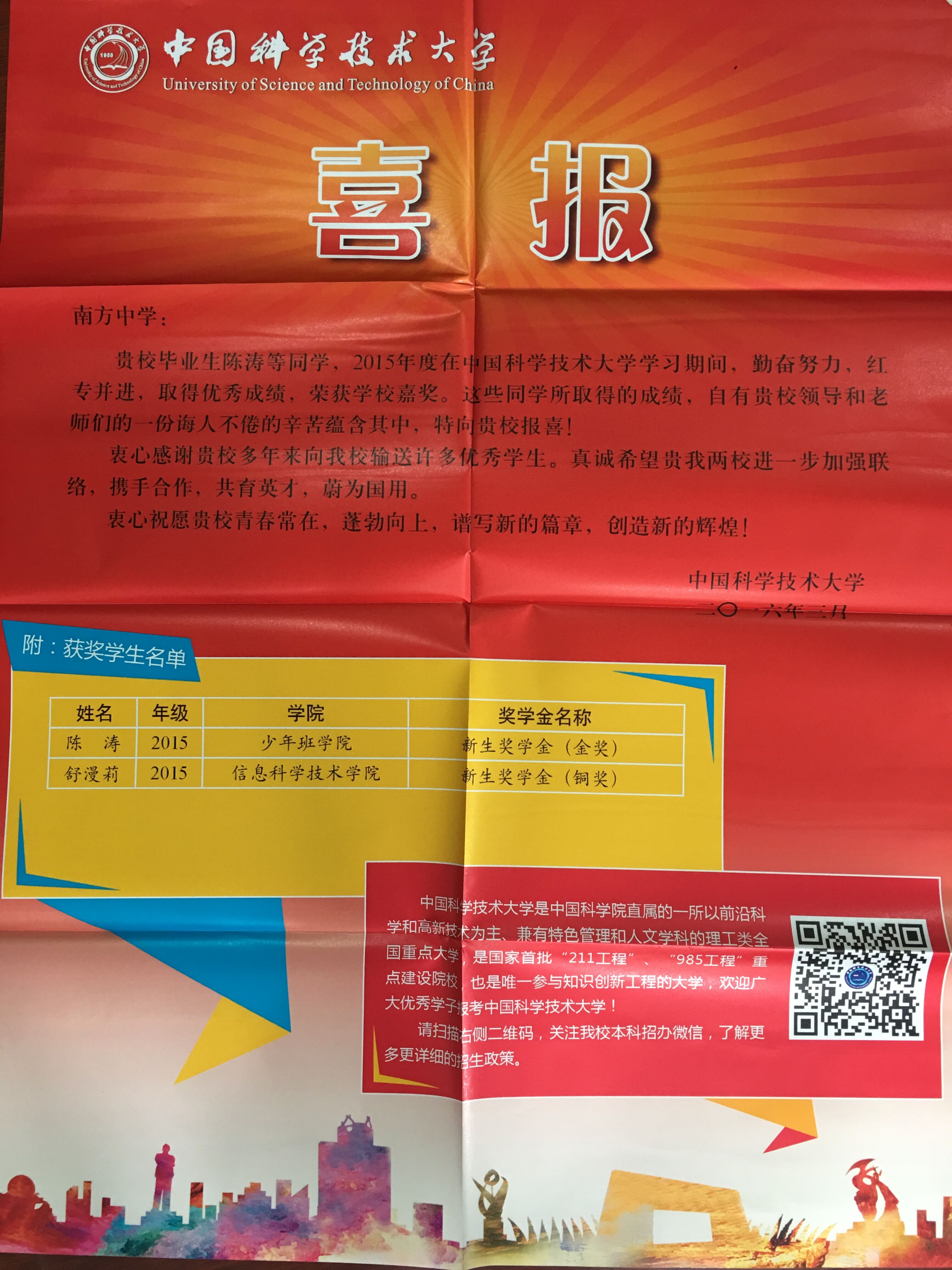 近日,中国科技大学向南方中学发来喜报 ,2015届毕业生陈涛、舒曼莉同学在大学期间勤奋努力,表现优异,喜获中国科技大学新生奖学金金奖和铜奖。