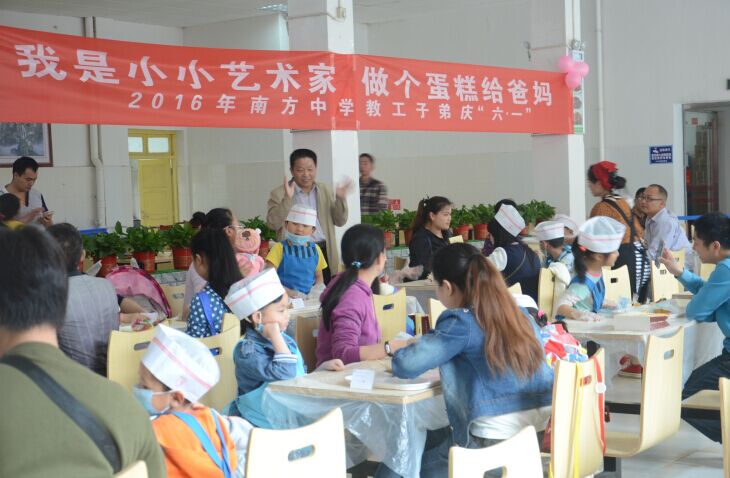 每年六一,学校工会都会组织有趣、有意义的活动。今年学校组织教师及子弟们自己动手做蛋糕。主题为“我是小小艺术家 做个蛋糕给爸妈”,当工会主席曾四喜先生宣布这个主题的时候,不少教师为之感动。教师们平时上班都在为别人孩子忙活着,很少有时间陪伴自己的孩子,这个活动不仅适合各种年龄层次,更能增进教师与孩子之间的感情交流。
