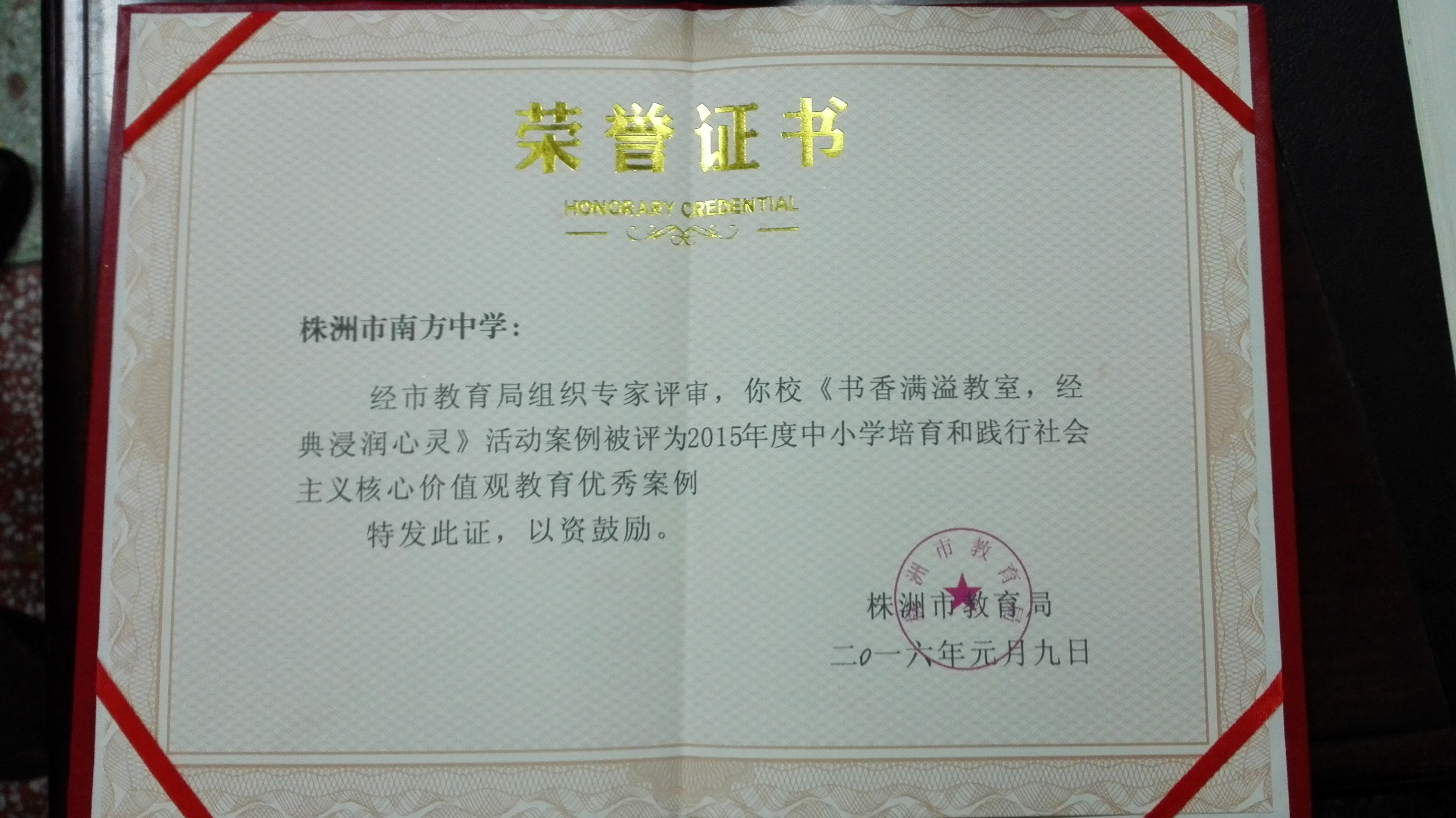 在2015年度中小学培育和践行社会主义核心价值观教育优秀案例中,我校选送的《书香满溢校园,经典浸润心灵》活动案例受到肯定,经市教育局组织专家评审,被评为优秀案例。