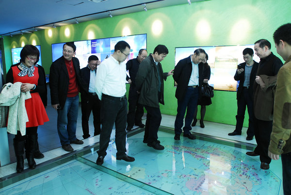 领导们踏上地理学科基地中的世界风情演示仪,亲自领略其中的妙趣。