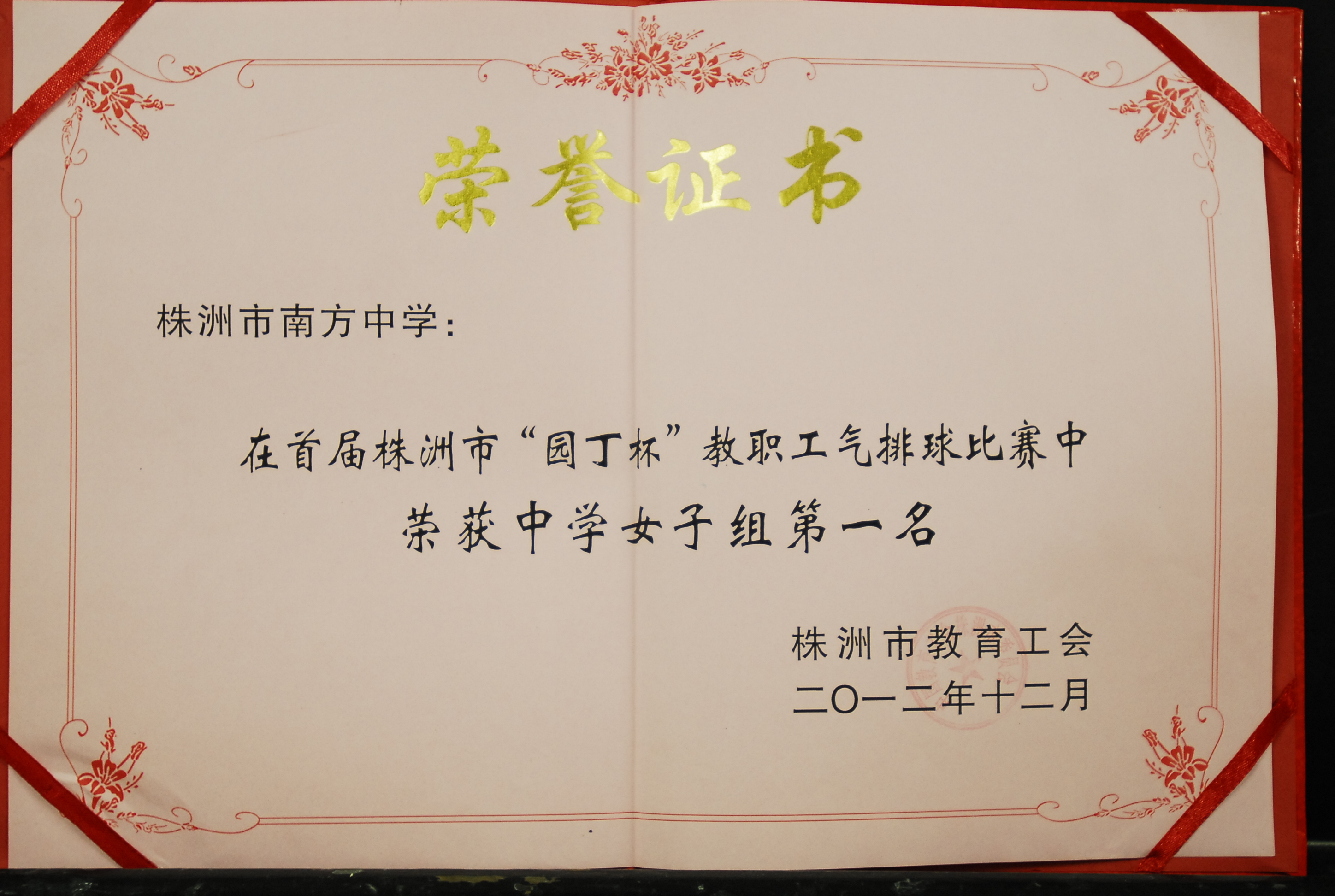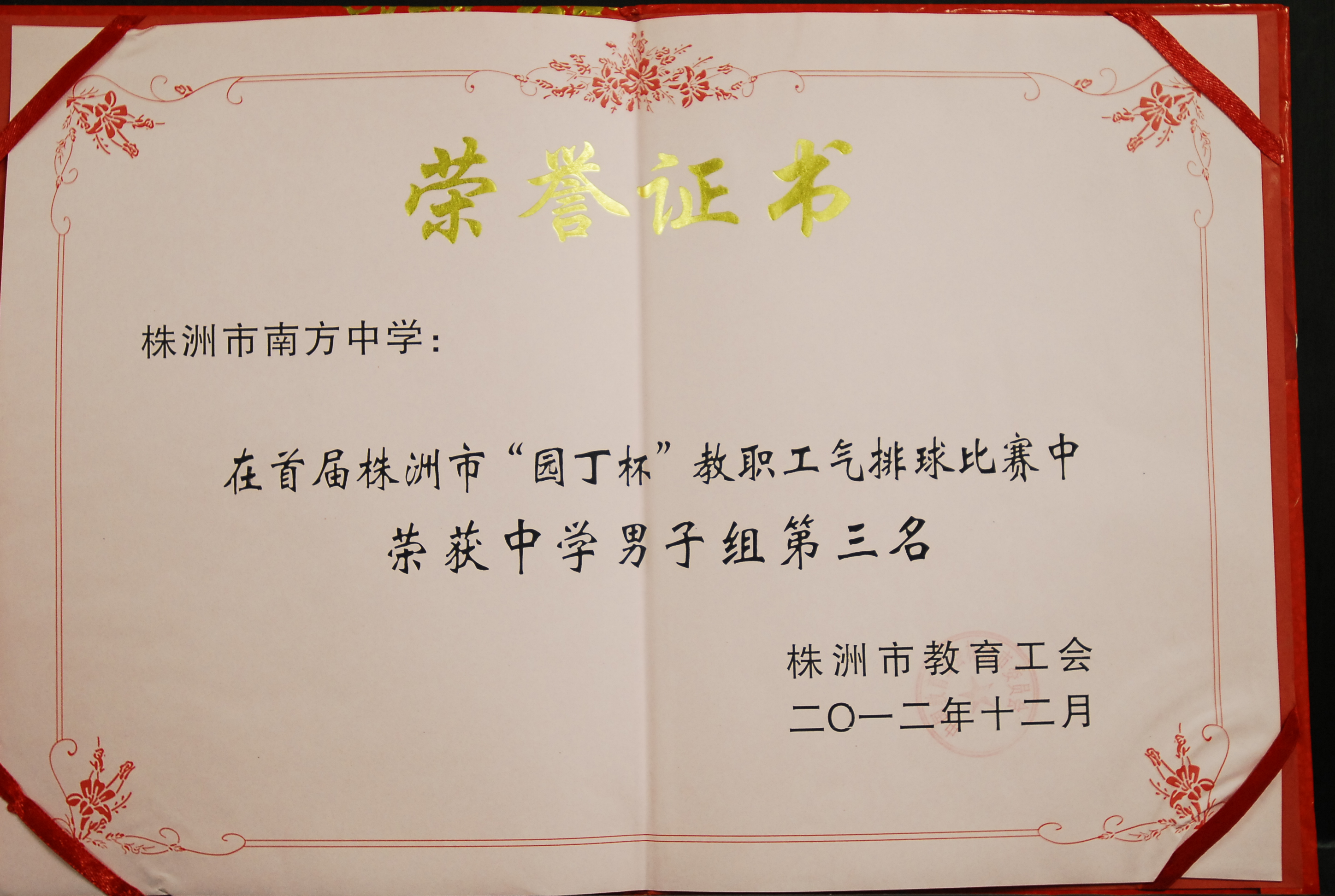 另外,在全市教育系统开展的“面对面、心贴心、实打实服务职工在基层”活动中,由曾四喜同志、肖建兵同志撰写的调研报告,在评选中获得二等奖。在推进教育健康工程活动中,南方中学组队参加全市首届(2012)“园丁杯”气排球比赛,南中职工男子代表队夺得第三名,女子职工代表队豪取第一名。在2012年度各基层单位教代会工作星级评估中,南方中学与其他17家单位被评为符合三星级标准单位(目前的最高级)。(肖建兵)