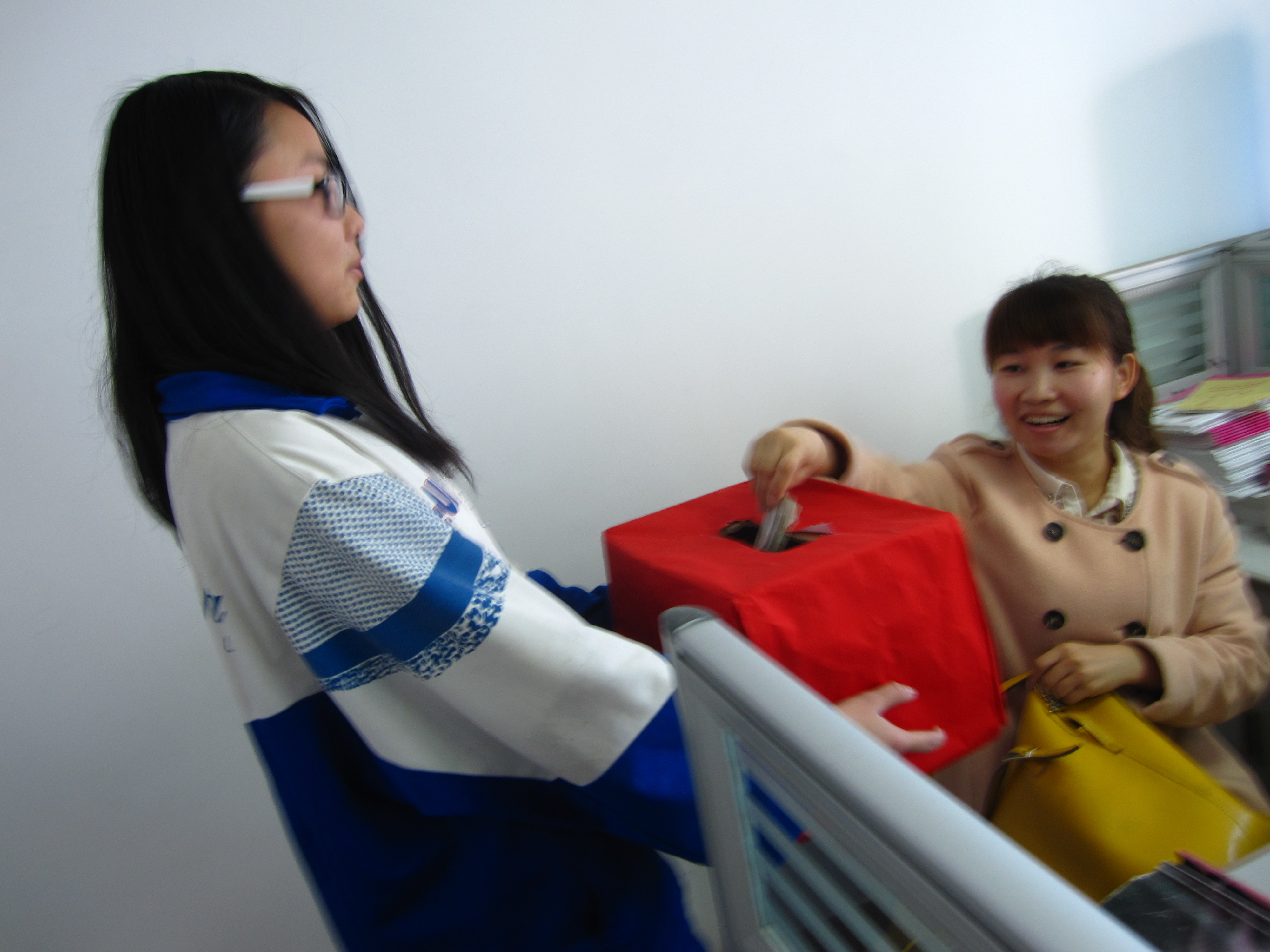 为积极响应株洲市教育局团委组织的希望工程“一元捐”活动,上周凤凰中学团委在校内张贴倡议书,让所有师生了解“一元捐”,参与到这个活动中来。承接着雷锋月,在这美丽的人间四月天,老师们率先垂范。4月1日,上午第二节课间,学生会团委部部长袁帼英抱着箱子,等待着每位自愿捐款的老师,一边有学生会成员在旁边拍照,记下每位捐款老师献出爱心的重要一刻。老师们用爱心点燃每一位求知学子的希望,为贫困学子撑起蔚蓝的天空,同学们快马加鞭,追赶着老师们的脚步,默默祝福着贫困学子。