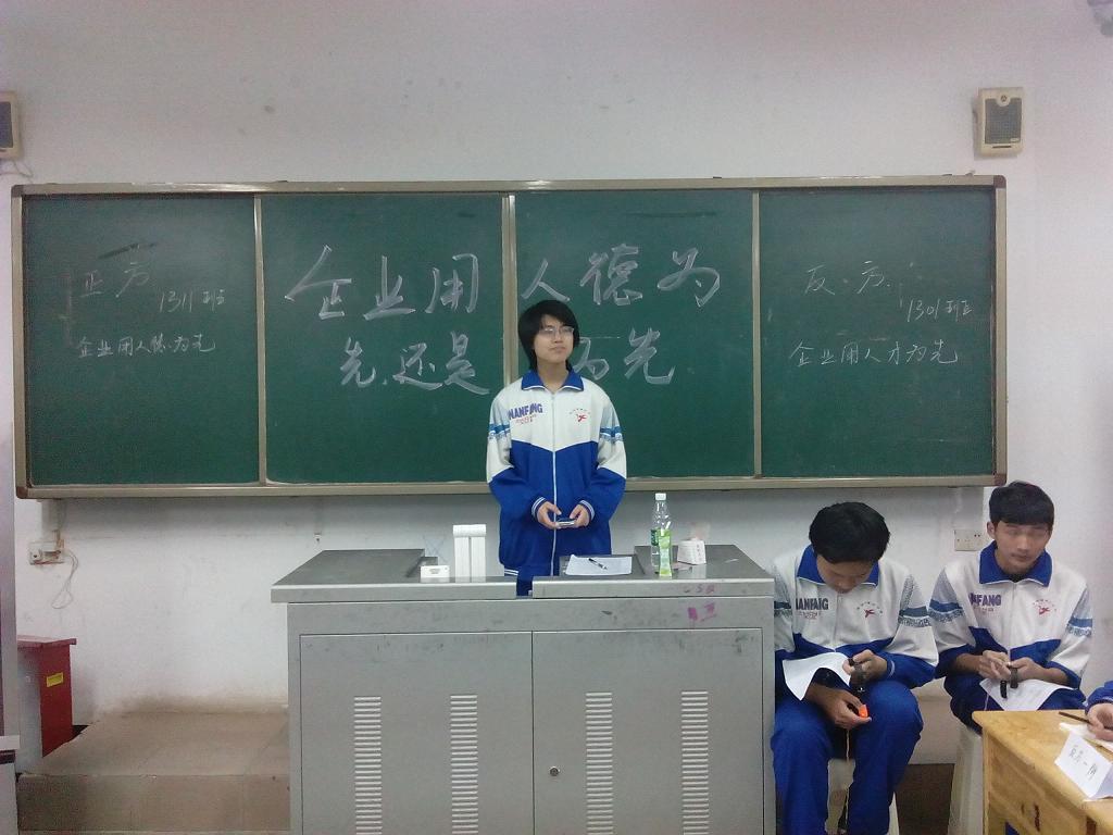 赛前,各班辩手利用一切可以利用的时间,通过各种渠道收集资料,做足了比赛的准备。赛中,各班的四位辩手信心满满。他们语言流畅,分析角度中肯,反驳能力强,风度端庄,表情自然有幽默感。他们始终团结一致,默契配合。辩手们的精彩表现博得了评委和观众的阵阵掌声!