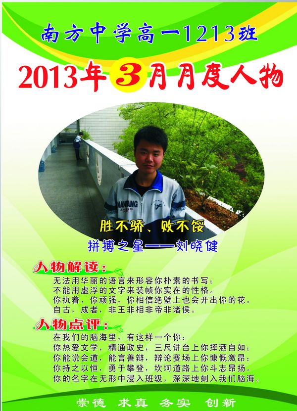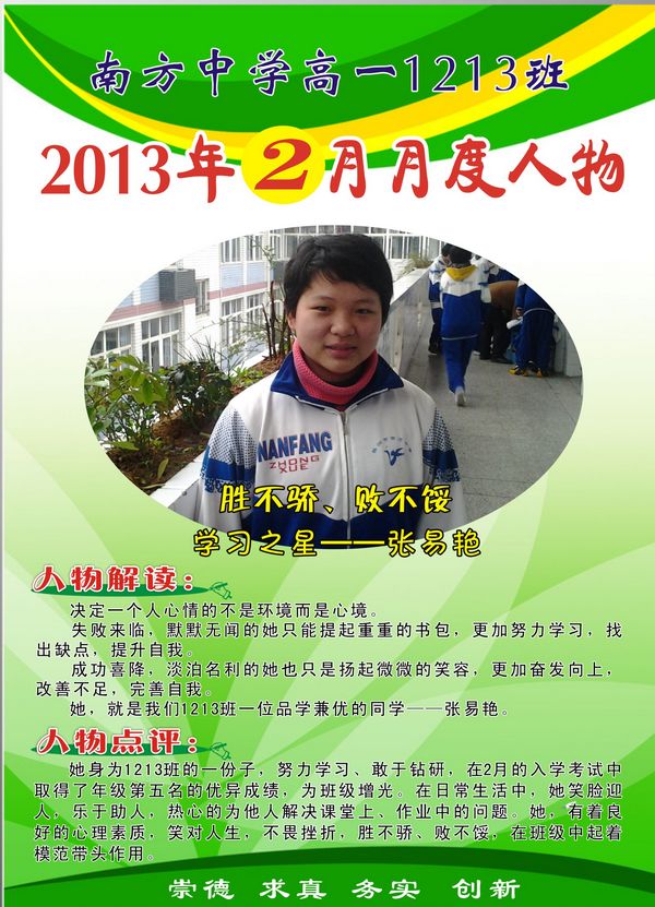 人人都有一颗向上的心,重要的是处在什么氛围下,才能挖掘才能,达到学习的最佳状态。月度人物评选活动给了同学们一个学习他人的优点和改正自己不足的机会,见贤思齐。自开展月度人物评选以来,1213班越来越团结,班级凝聚成了一股强大的力量,形成你追我敢的新风尚!