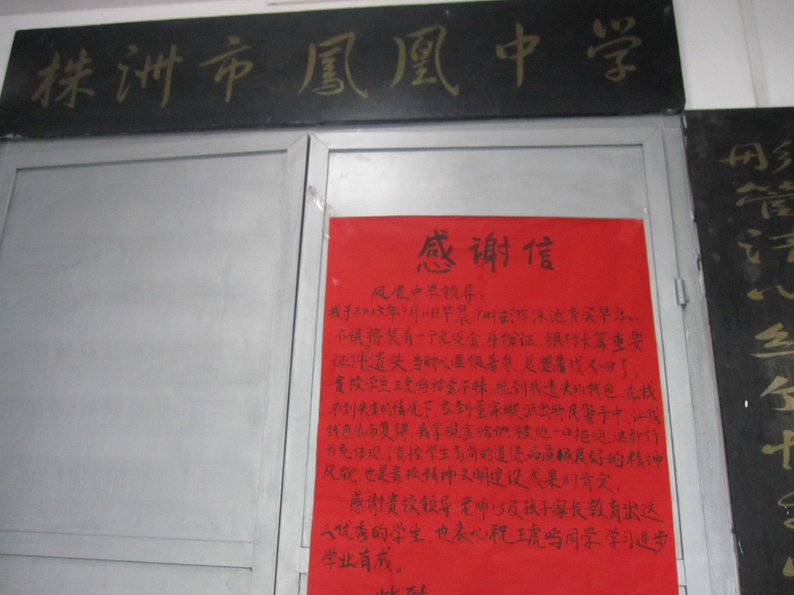 市民吴振江走路时,不慎将兜内钱包丢失,被凤凰中学高一1303班的王虎鸣捡到送到董家段派出所,后如数返还。吴师傅送来学校一封感谢信,对王虎鸣表示感谢。