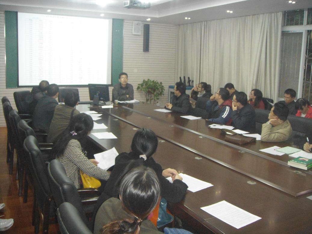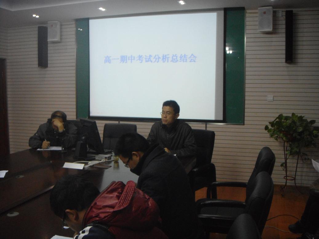 (本网讯:)十一月十三号下午,秋风冷雨,寒气袭人,高一年级全体教师在科教楼生物基地办公室召开期中考试分析总结会。会议由高一年级组长詹志坚老师主持。年级主任朱志雄用图表形式,展示各班各科考试的相关数据,对本次期中考试进行了周密的分析和系统的总结,指出了年级工作的亮点,表扬了部分优秀教师和优秀班主任,同时对后半期的教学工作提出了希望和要求。