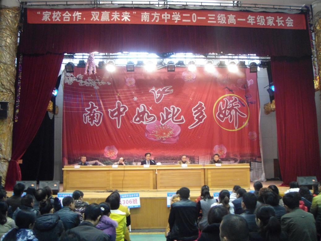 (本网讯:)为了充分展示南方中学良好的校风校貌,使广大家长更全面地了解自己的孩子,了解学校,促进学校教育与家庭教育的协调发展,高一年级于2013年11月24日上午九点至十二点,召开了期中考试后全体学生家长会。本次家长会分为两个部分,先是在学校艺体馆举行,然后以各个班级为单位分别召开班级家长会。