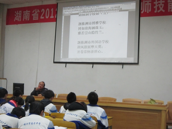 (本网讯) 鉴于高二学子对于“楹联”知识的浓厚兴趣,近日左建军老师又在外国语多媒体教室为高二学子奉献了一堂精彩的“楹联”讲座。如果说上次讲座更多的是激发学生对于楹联的兴趣,那么此次讲座则更注重学生对于撰写楹联技法的了解与把握,尤其是对“贴切”的体会。为让学生更为深刻地理解楹联之“贴切”,左老师结合自己的作品做了详细分析。其作品一呈现,现场的学生不觉惊叹绝妙,正所谓:文之妙者为诗,诗之精者为联,联之绝者在贴切。